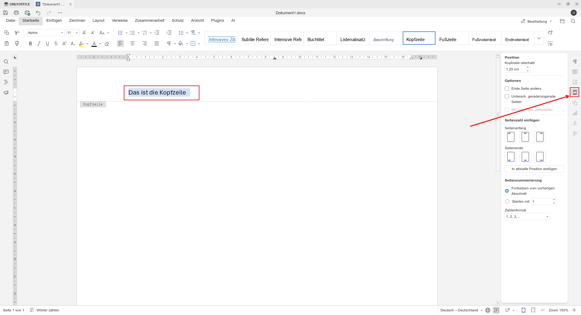 Um Kopf- und / oder Fußzeilen zu bearbeiten, rufen Sie diese durch Doppelklick – für die Kopfzeile im oberen Bildschirmrand – auf. In der Symbolleiste rechts finden sie nun ein Icon, mit der die Bearbeitungsleiste eingeblendet wird…