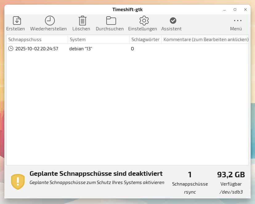 Timeshift gilt unter Linux nicht als klassisches Backup-Programm, sondern primär als Tool zur Erstellung von System-Snapshots beziehungsweise Systemwiederherstellungspunkten. Es wird genutzt, um das Betriebssystem (Systemdateien und -einstellungen) zu einem bestimmten Stand zurückzusetzen, etwa nach einem Update oder einer fehlerhaften Änderung.