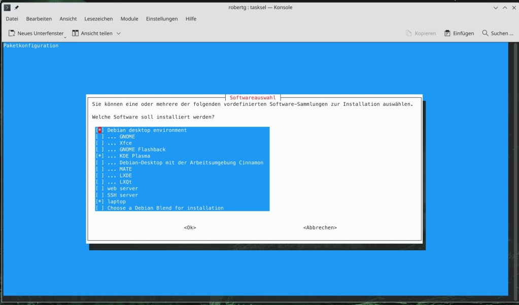 In der Liste finden Sie die Paket-Gruppen, je nach Distribution kann diese länger oder kürzer sein. Mit dem roten Cursor markieren Sie eine Paket-Gruppe – dazu navigieren Sie mit den Pfeiltasten (auf / ab) und aktivieren oder deaktivieren die Checkbox mit der Leertaste.