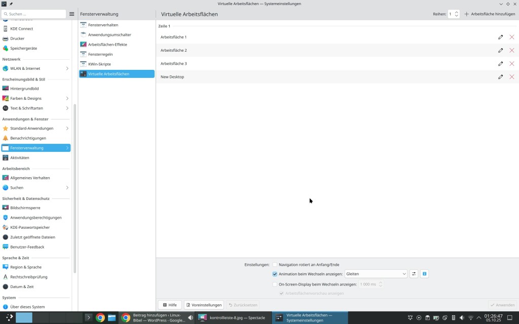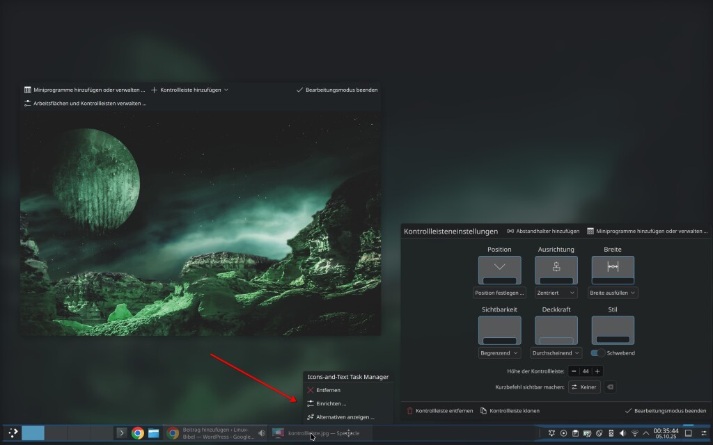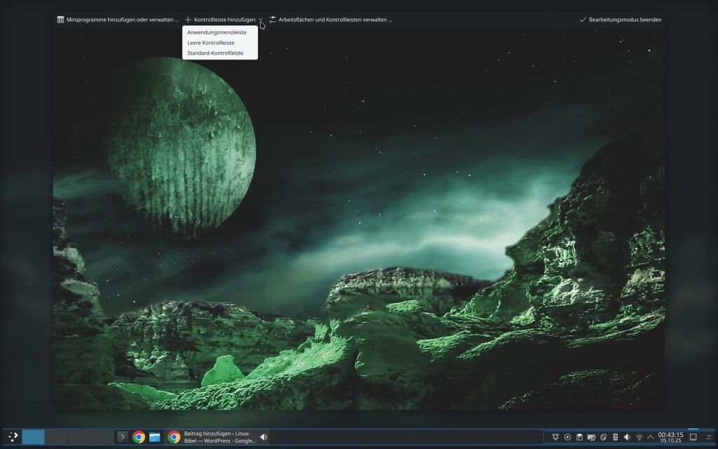 Im zentralen Bereich vom KDE-Desktop steht natürlich die Kontrollleiste, also das Panel, vergleichbar mit der Taskleiste von Windows. Wie unter KDE üblich, gibt es auch rund um die Kontrollleiste massenhaft Einstellungen.