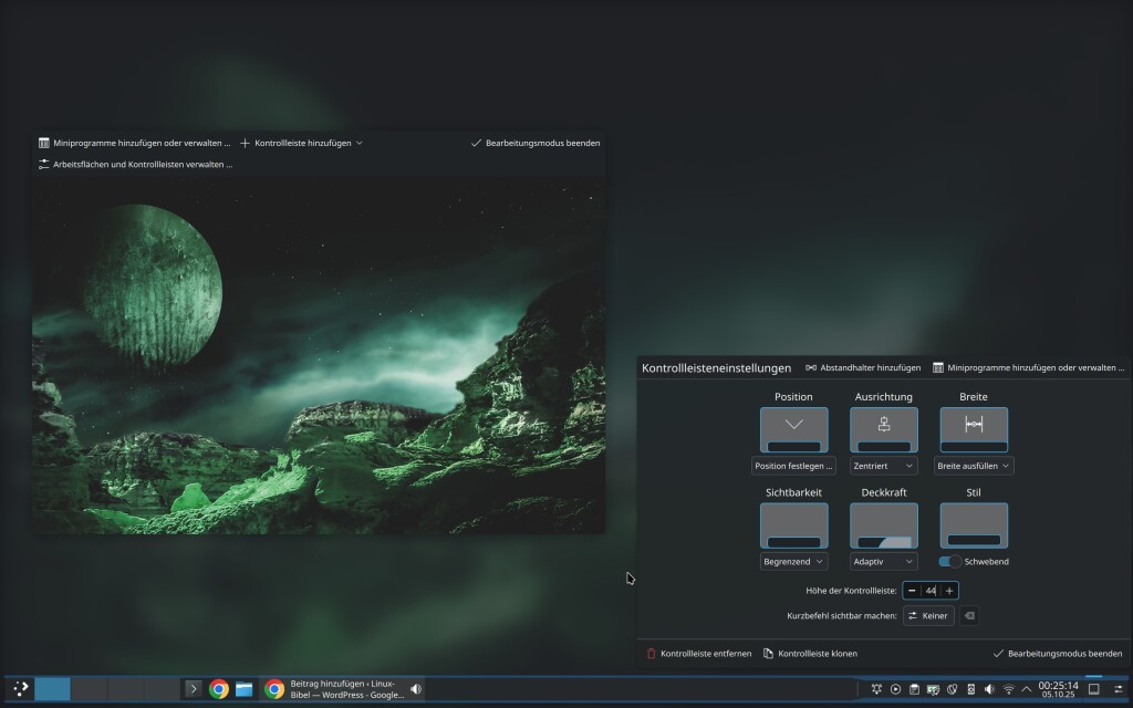 Mit den Schaltern im Bereich rechts unten können Sie die Position festlegen – also unten, oben, links oder rechts. Sie können anpassen, ob sich diese eher rechts, mittig oder links befinden soll, auch können Sie die Breite ändern – ob diese die komplette Breite des Bildschirmes ausfüllen soll, oder die komplette Höhe, wenn Sie diese an den linken oder rechten Bildschirmrand gelegt haben. Dazu können Sie angeben, ob sich die Kontrollleiste automatisch ausblenden soll – in diesem Fall kommt diese wieder hervor, wenn Sie den Mauszeiger an den passenden Bildschirmrand legen, oder einfach die Super-Taste (für Winlinge – die Windows-Taste, die sich offiziell auch dort „Super“ nennt) drücken. Auch können Sie die Deckkraft anpassen und ob diese schwebend dargestellt werden soll – also nicht direkt an den Bildschirmrand andockt. Auch die Höhe der Kontrollleiste lässt sich hier ändern.