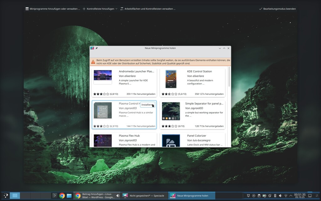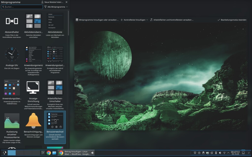 Die Kontrollleiste ist so gesehen nur ein Container (ein Plasmoid oder auch Miniprogramm) für weitere Einträge. Sie haben oben schon gesehen, wie Sie Einträge aus der Kontrollleiste entfernen – Bearbeitungsmodus starten, Mauszeiger auf den Eintrag legen. Fast so einfach fügen Sie aber auch weitere hinzu – starten Sie den Bearbeitungsmodus der Kontrollleiste und wählen „Miniprogramme hinzufügen„: