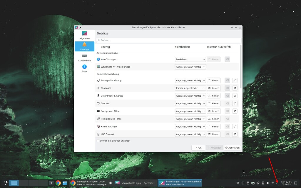 Ein sehr wichtiger Bereich in der Kontrollleiste ist der Systembereich der Kontrollleiste – in dieser zeigen sich etwa das Netzwerk, der Lautstärkeregler und viele andere Dinge. Sie können anpassen, welche Einträge sich dort wiederfinden, oder ob sich diese zur zeigen sollen, wenn diese auch wichtige Meldungen habe, Dazu klicken Sie mit der rechten Maustaste in den Systembereich – genau unter den kleinen Pfeil und wählen „Systemabschnitt der Kontrollleiste einrichten„: