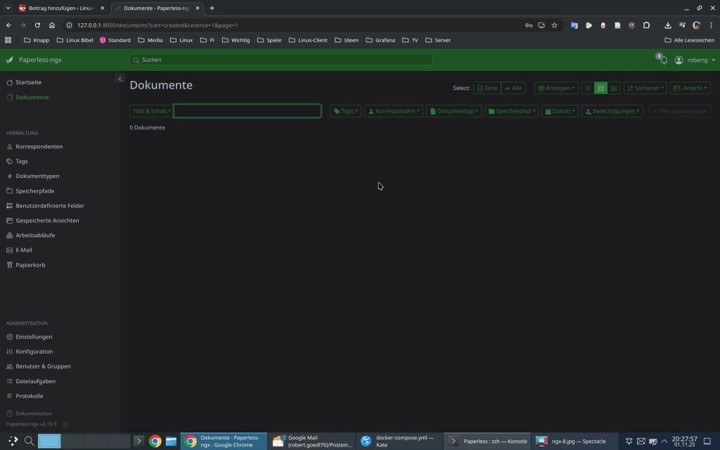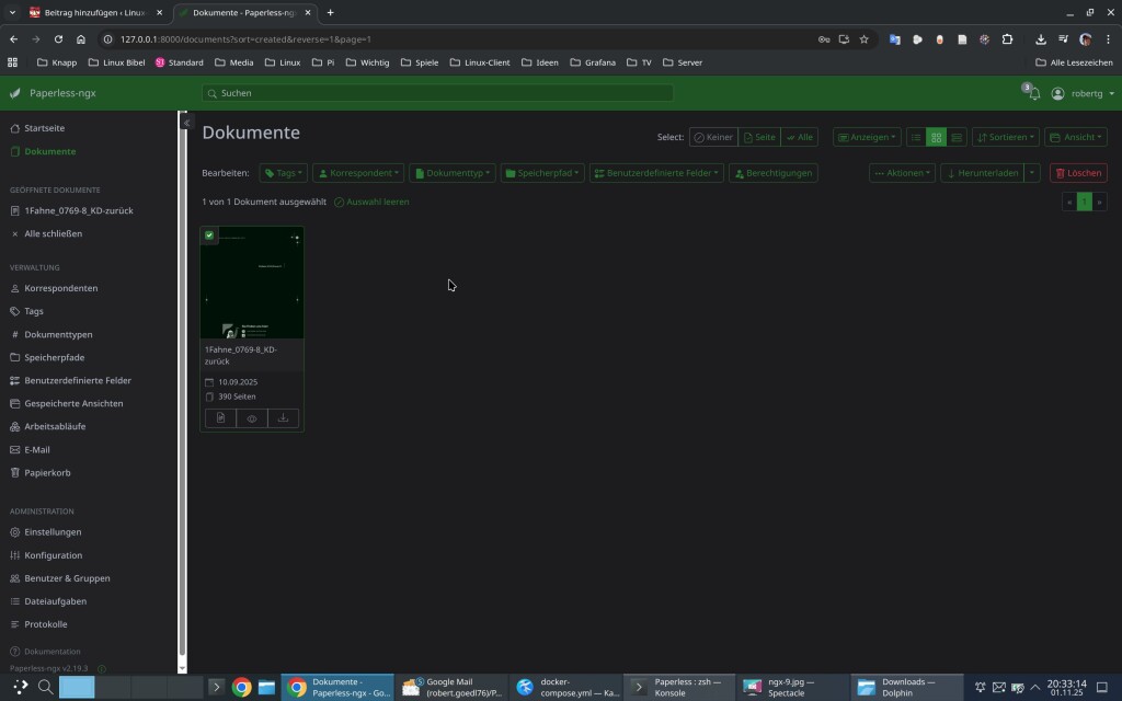 Hier sind noch keine vorhanden – klicken Sie auf die „Startseite“ und auf „Dokumente hochladen“ – ich habe gleich einmal mit meinem neuen Buch rund um Debian 13 begonnen, knapp 40 Megabyte als PDF – die Integration inklusive OCR hat die ganze Geschichte keine Minute gedauert: