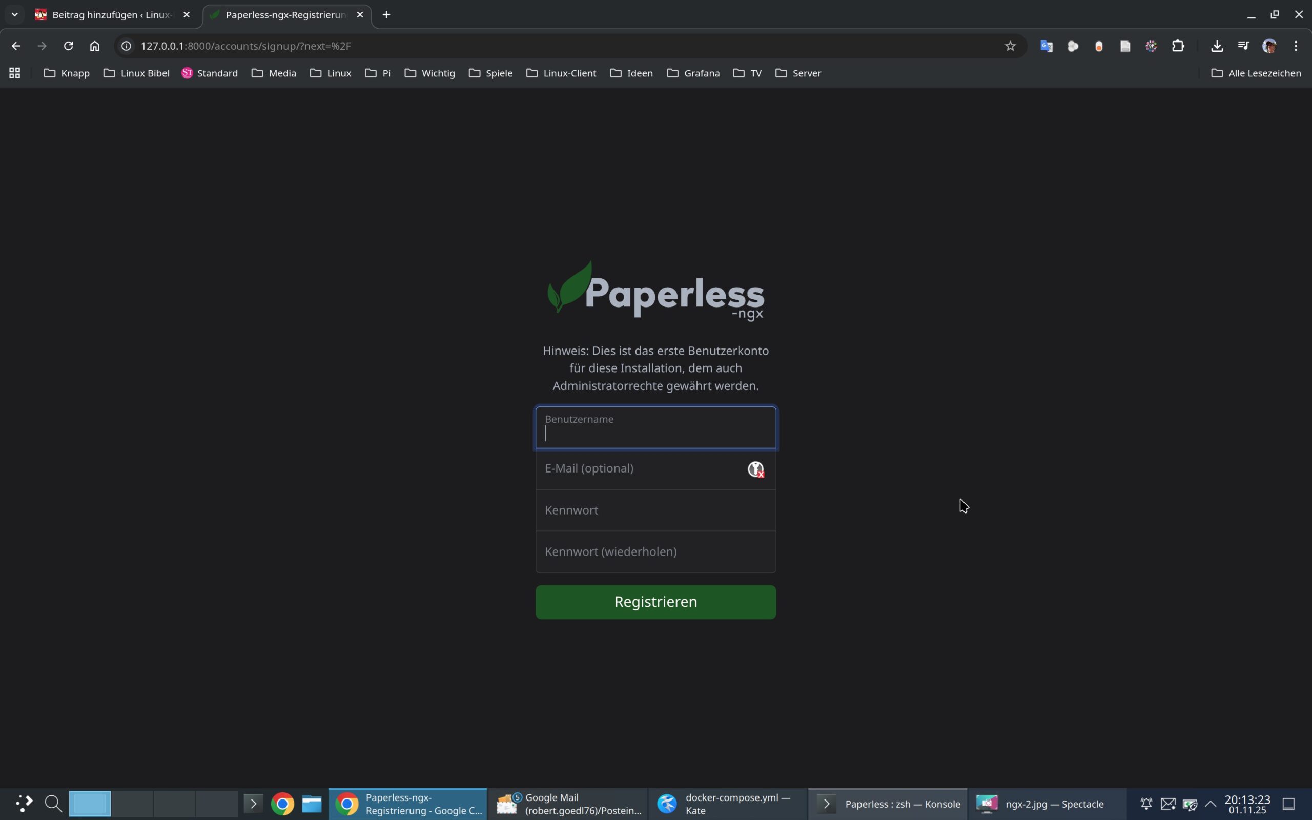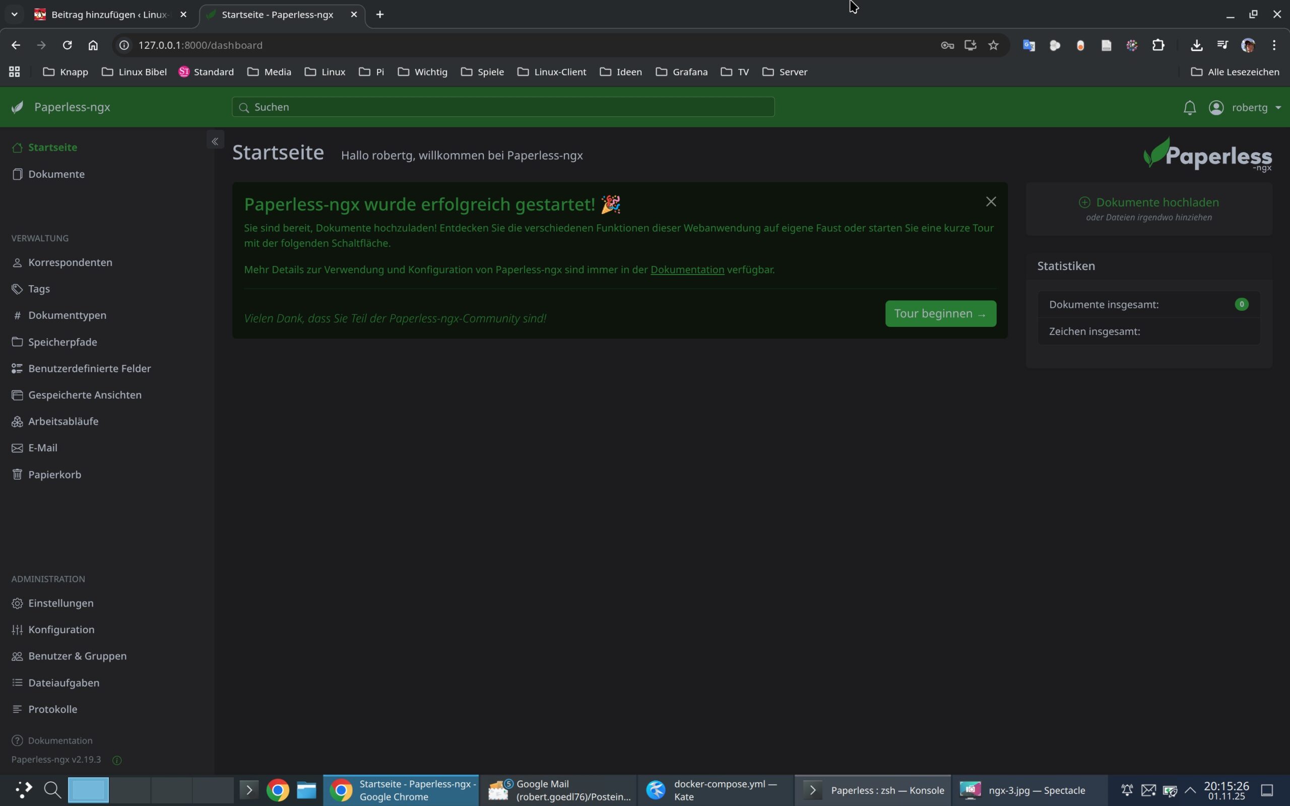 Jetzt können Sie Paperless im Webbrowser öffnen – vom lokalen Host aus „http://localhost:8000„, von anderen Systemen aus mit der IP-Adresse „http://xxx.xxx.xx.xx:8000„: