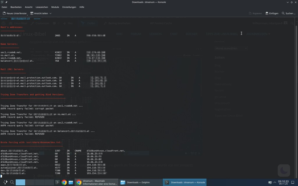 Einiges bekommt man unter Linux schon mit Standard-Mitteln heraus, mit dnsenum holt man jedoch alles Mögliche über eine Domain heraus, was über deren Infrastruktur zu finden ist.