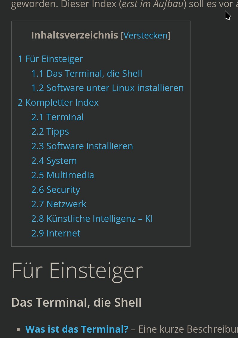 In den einzelnen Kategorien finden Sie wieder die Beiträge mit einer kurzen Beschreibungen verlinkt. Kleiner Tipp für Linux-Einsteiger – um nicht wieder jedes Mal zum Index zurückkehren zu müssen, klicken Sie mit der linken Maustaste auf den Link.