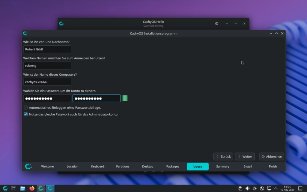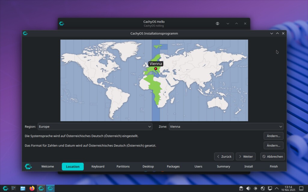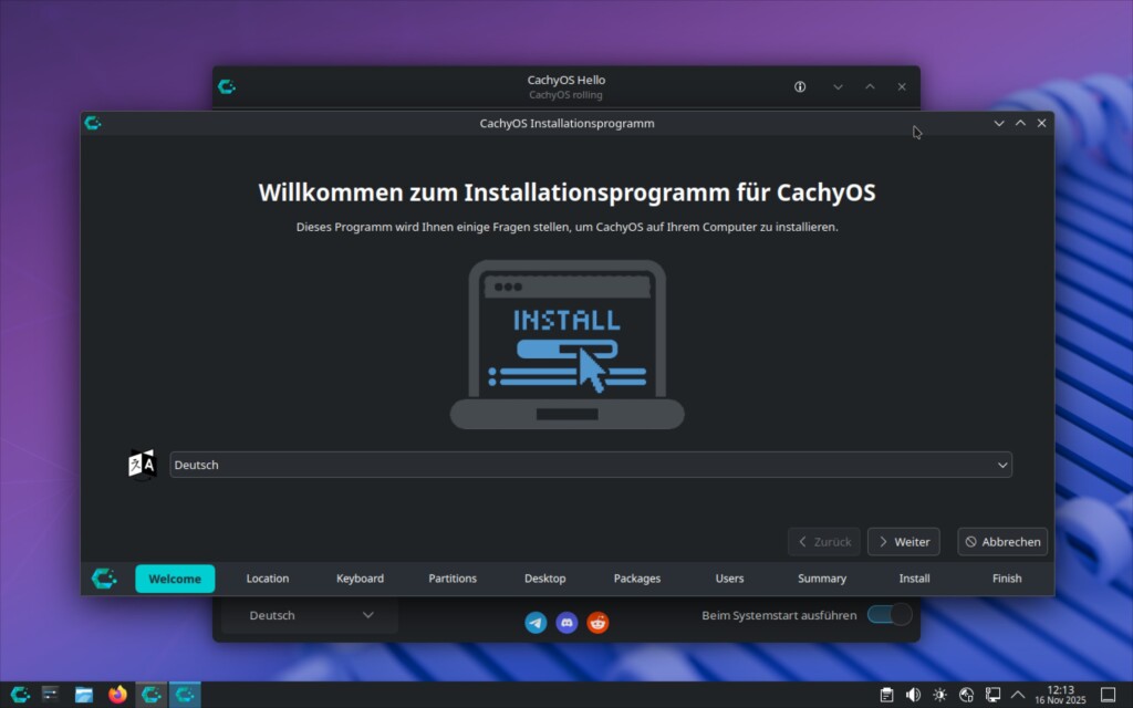 CachyOS nutzt Calamares als Installer – es läuft also alles sehr einfach ab – Sie können die Sprache anpassen, diese wird während der Installation und auch später im installierten System genutzt.