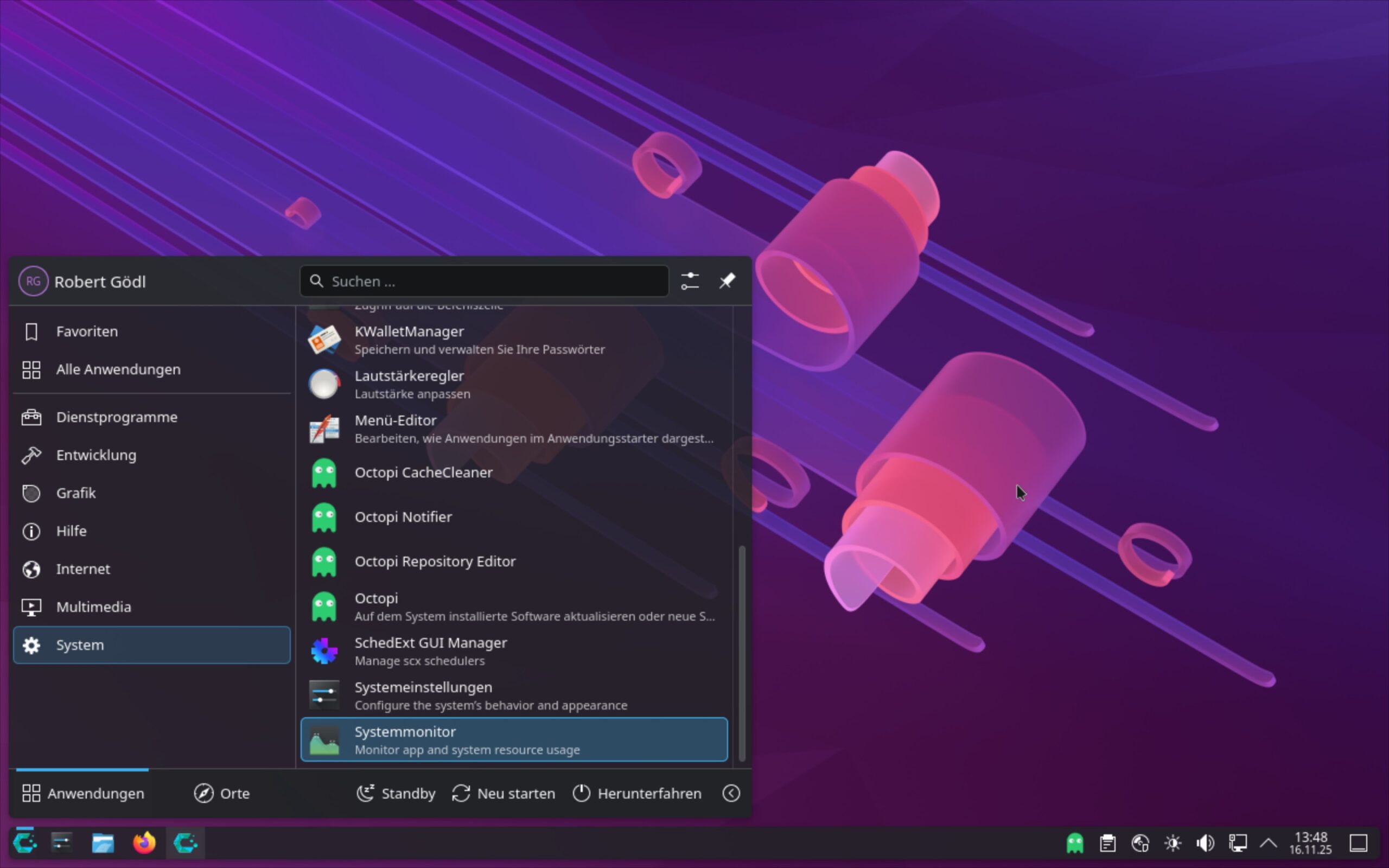 Wie schon beschrieben – um die jeweilige Desktop-Umgebung kümmern wir uns hier nicht, dazu gibt es schon genug Beiträge auf der Linux Bibel. Wir sehen uns die Spezialitäten an. Viel geändert hat sich nicht, es gibt ein paar zusätzliche KDE-Anwendungen und solche, für das Arch-System.