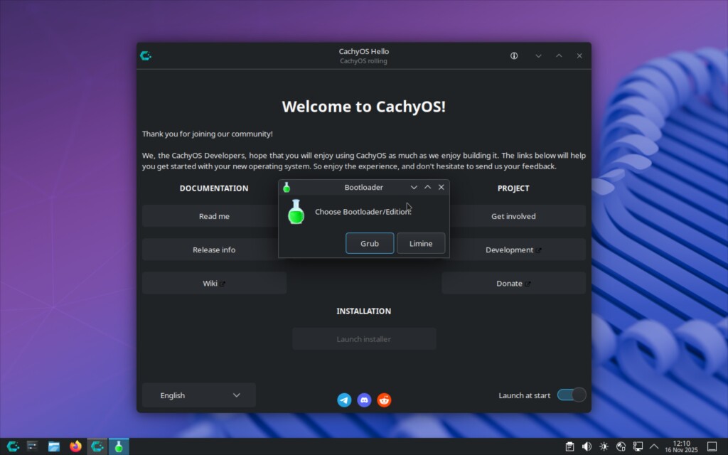 Nachdem Sie den Schalter „Launch Installer“ aktiviert haben, werden Sie nach dem gewünschten Bootloader gefragt – ich würde hier „GRUB“ wählen – ganz ehrlich, von Limine habe ich noch absolut keine Ahnung. Die Sprache können Sie links unten auch dem Start des Installers anpassen: