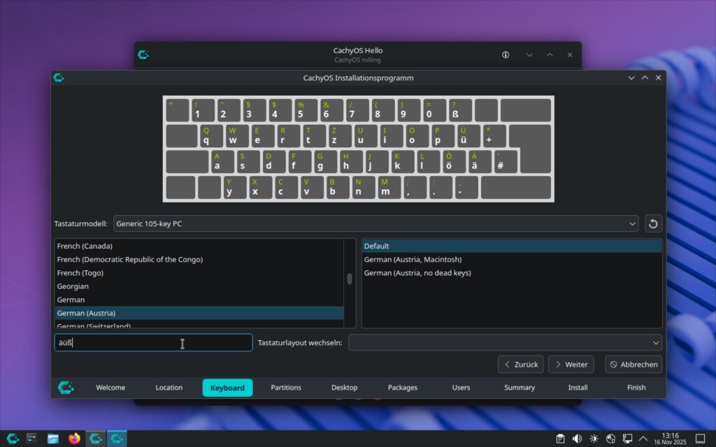 Es folgt das Tastaturlayout, auch dieses wird automatisch angepasst, testen Sie die Sondertasten.