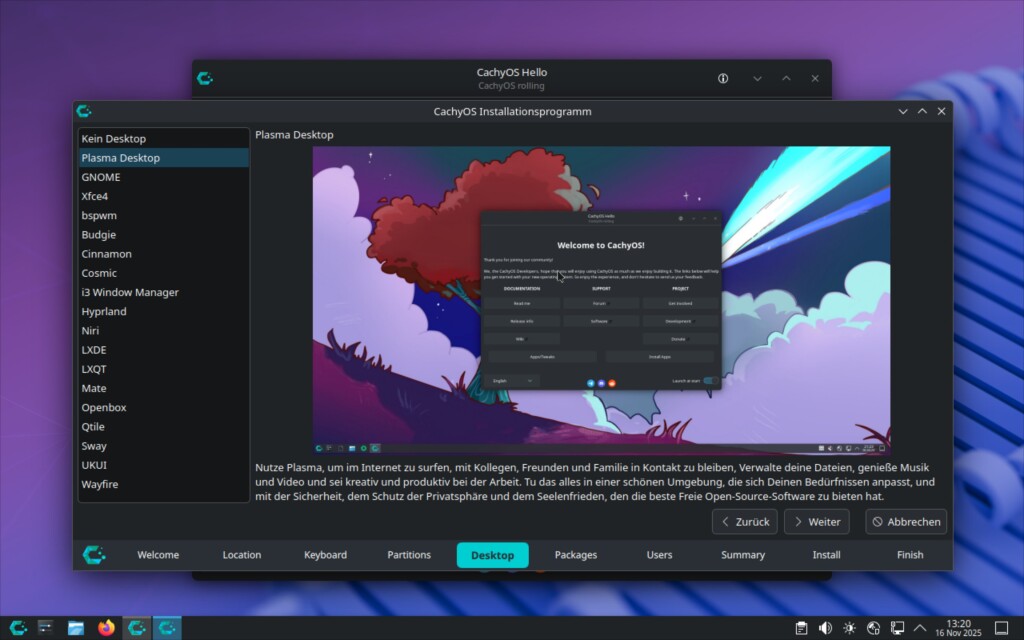 Sie können das System testen, solange Sie die Installation nicht ausführen, bleibt der Rechner unverändert. Wir starten gleich einmal die Installation – haben Sie das Begrüßungsfenster geschlossen, finden Sie dieses im Anwendungsmenü unter der Kategorie System unter dem Eintrag „CachyOS Hello„: