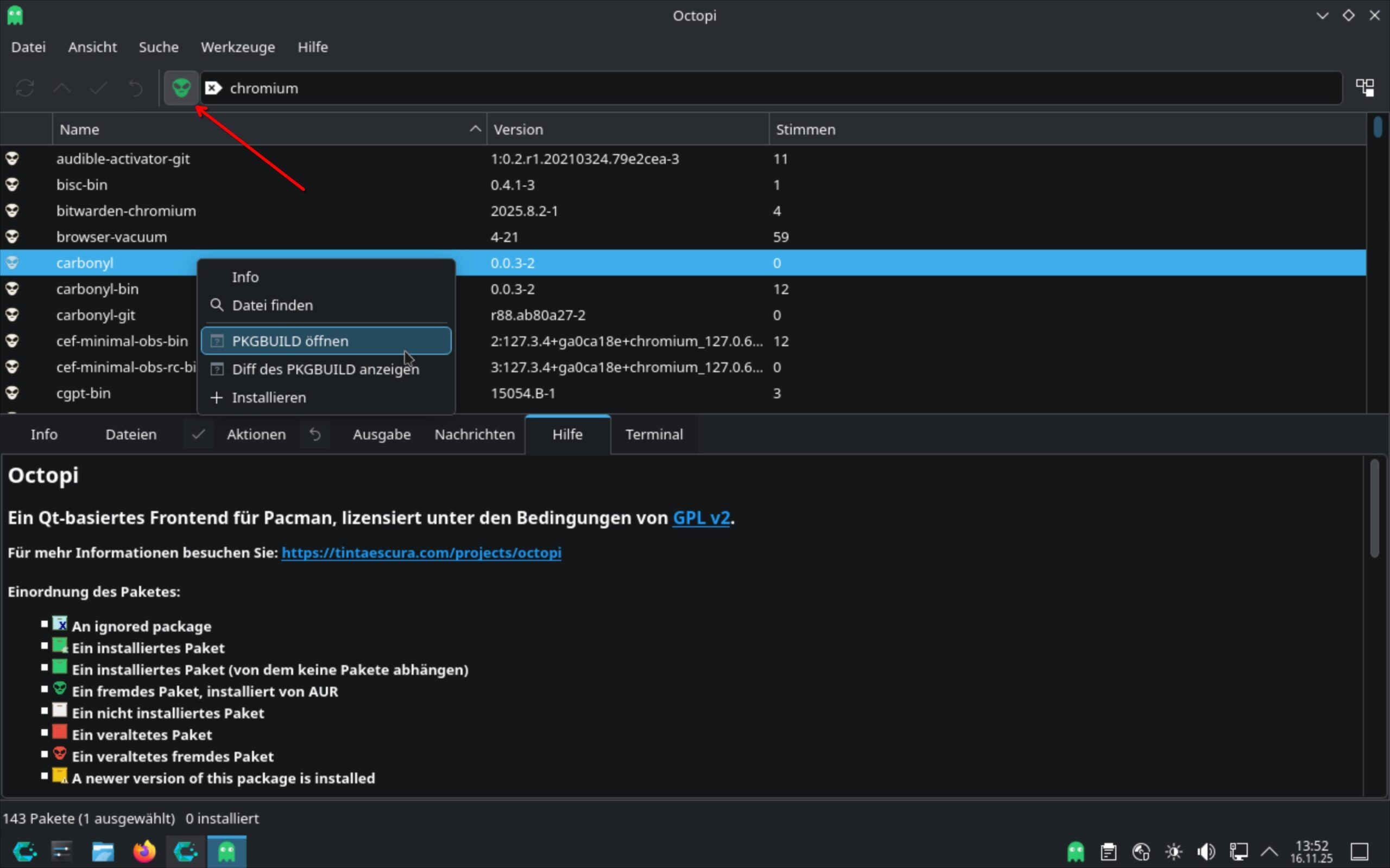 Auch das AUR ist natürlich über das Icon mit dem grünen Alien eingebunden – hier sollten Sie natürlich wieder wissen, was Sie tun – es ist AUR. Auch zum AUR gibt es entsprechende Beiträge auf der Linux Bibel.