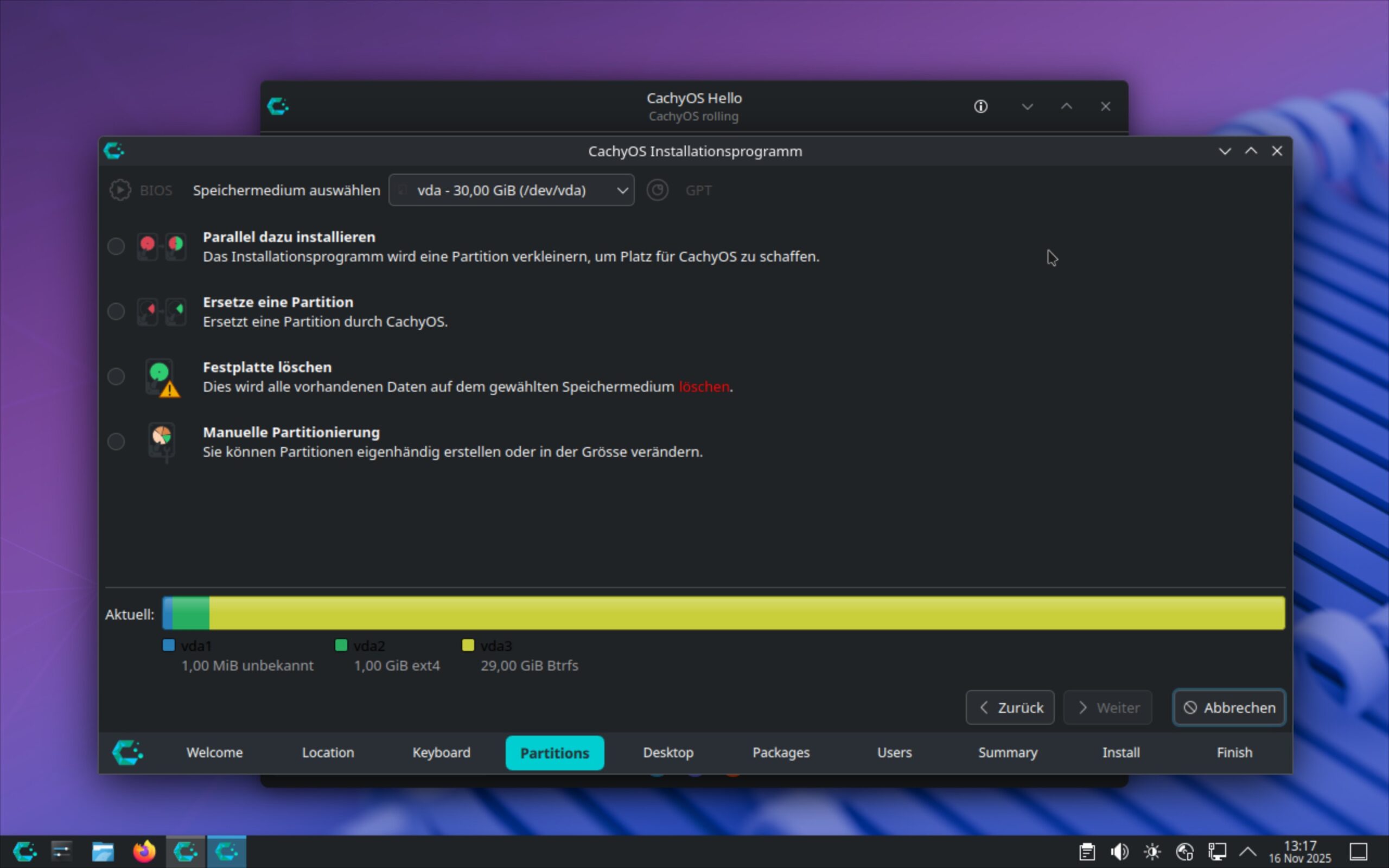 Sie können das System testen, solange Sie die Installation nicht ausführen, bleibt der Rechner unverändert. Wir starten gleich einmal die Installation – haben Sie das Begrüßungsfenster geschlossen, finden Sie dieses im Anwendungsmenü unter der Kategorie System unter dem Eintrag „CachyOS Hello„: