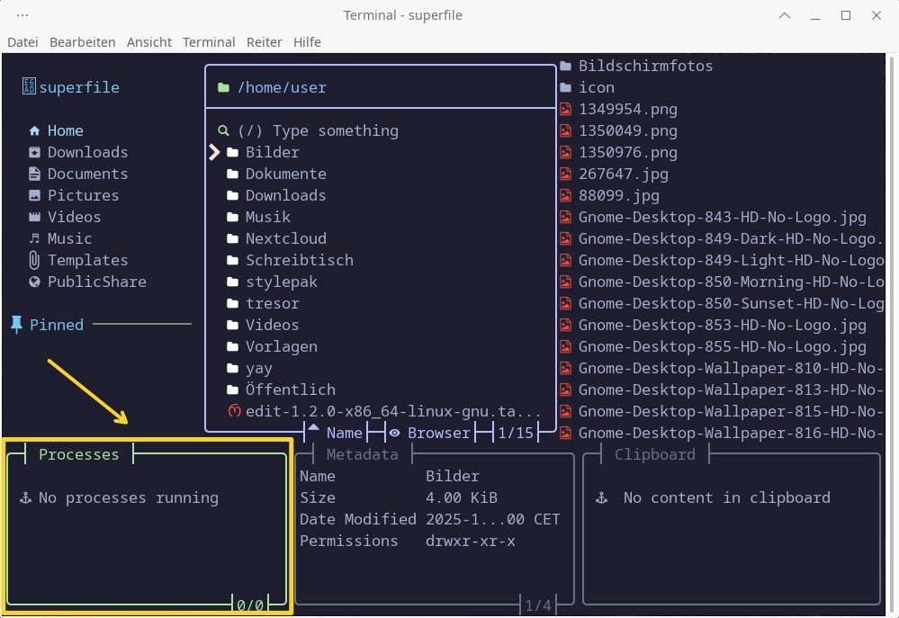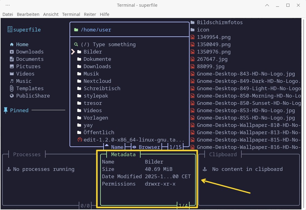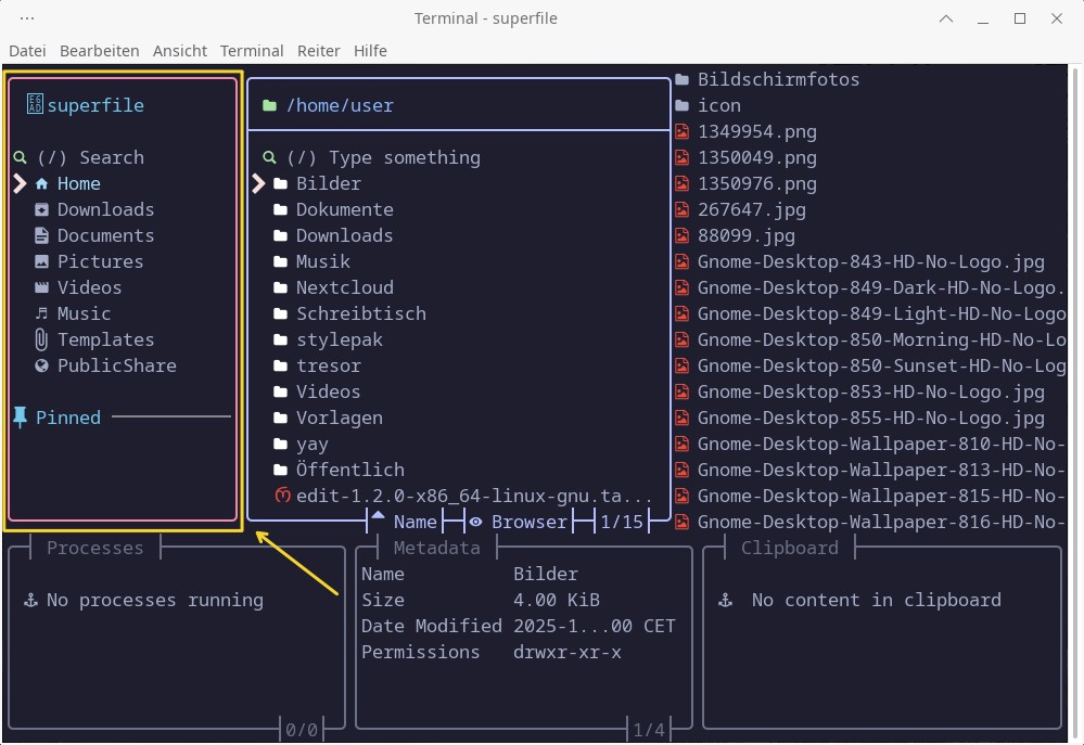 Mit „q“ oder „Esc“ verlässt man Superfile jederzeit und kehrt zum Terminal zurück.