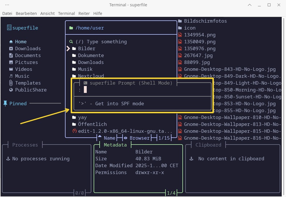 Mit : eine Shell im aktuellen Verzeichnis öffnen und dort beliebige Shell-Kommandos ausführen.
