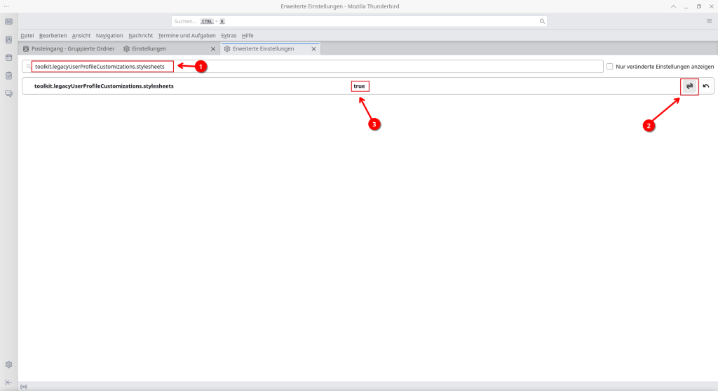 Setzen Sie hier den Wert von „false“ auf „true“ mit Hilfe des Schalters „2“. Schließen Sie alle geöffneten Reiter und dann Thunderbird selbst.