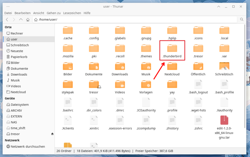 Navigieren Sie nun zu den versteckten Ordner .thunderbird…