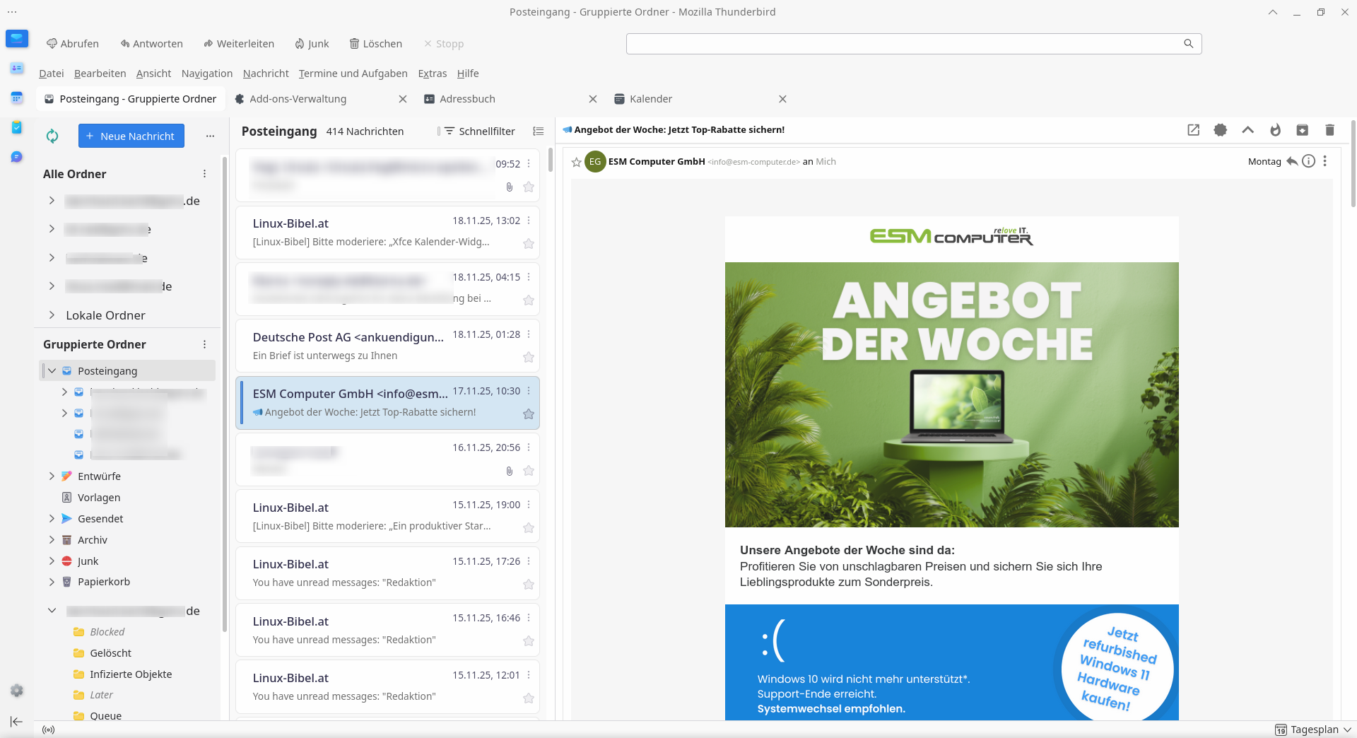 FluentBird funktioniert grundsätzlich auch unter Linux, bietet dort jedoch nicht das volle Spektrum an visuellen Effekten wie unter Windows 11. Das Theme selbst – die moderne Fluent-Oberfläche – wird auch unter Linux korrekt dargestellt und wertet Thunderbird deutlich optisch auf. Unter Linux fehlt die charakteristische „Mica“-Transparenz, da diese Spezialeffekte System-bedingt ausschließlich von Windows 11 bereitgestellt werden.