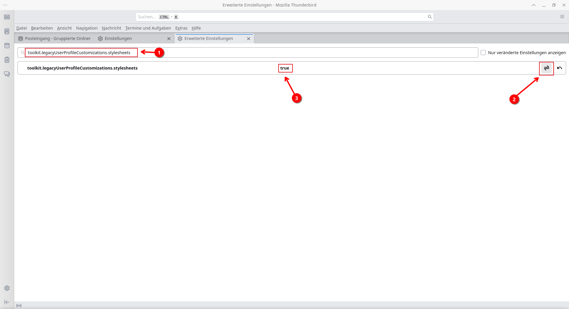 Setzen Sie hier den Wert von „false“ auf „true“ mit Hilfe des Schalters „2“. Schließen Sie alle geöffneten Reiter und dann Thunderbird selbst.