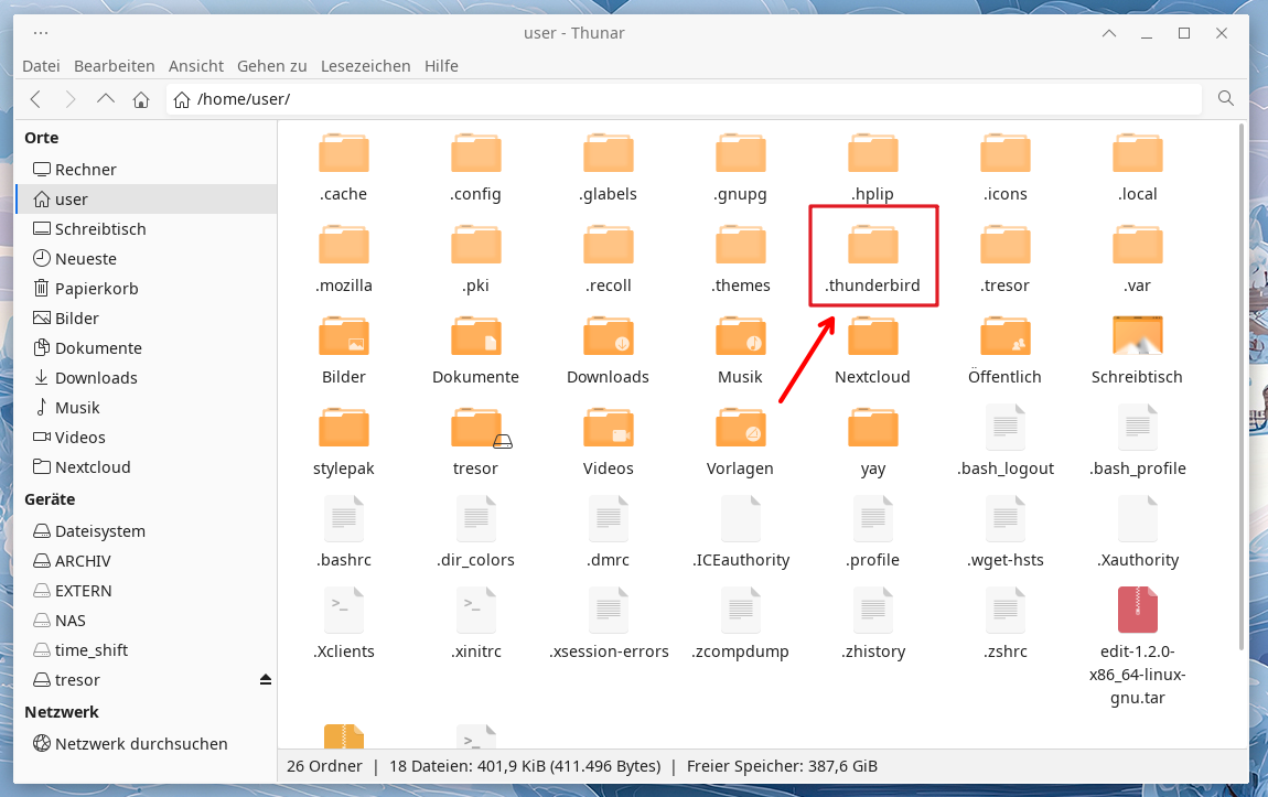 Navigieren Sie nun zu den versteckten Ordner .thunderbird…