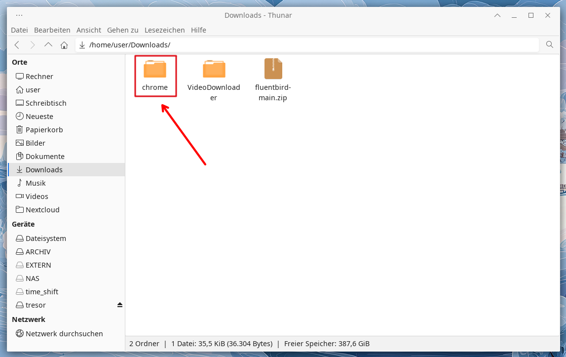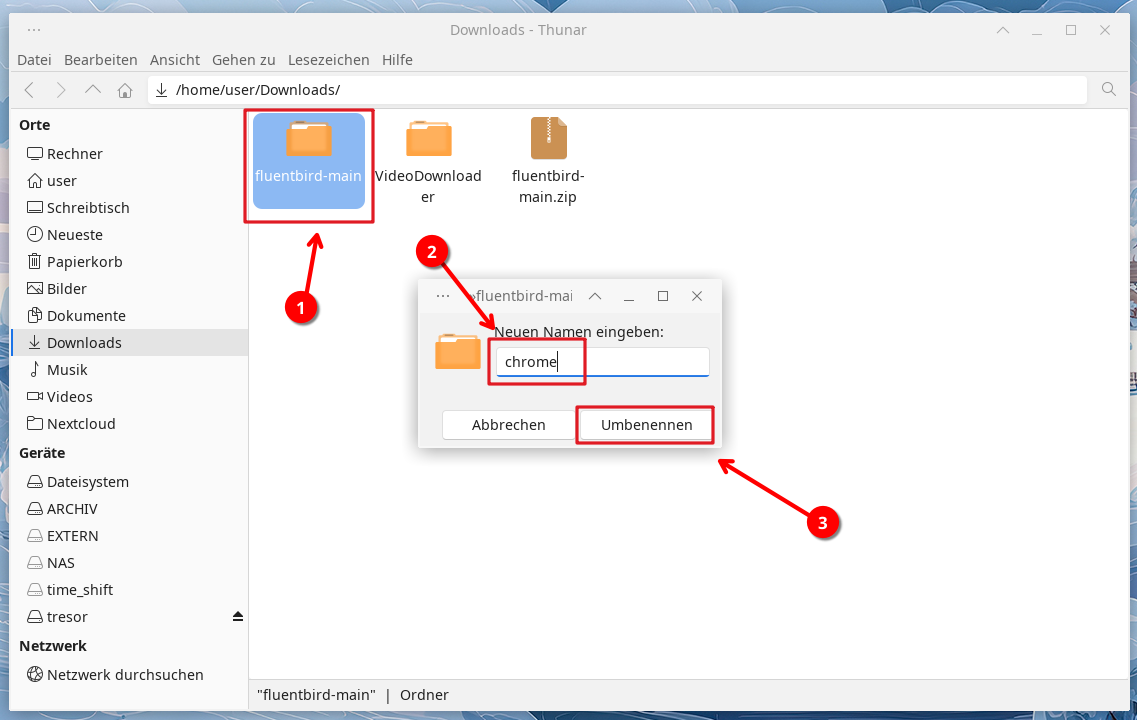 Den soeben entpackten Ordner benennen Sie per Rechtsklick darauf in chrome um…