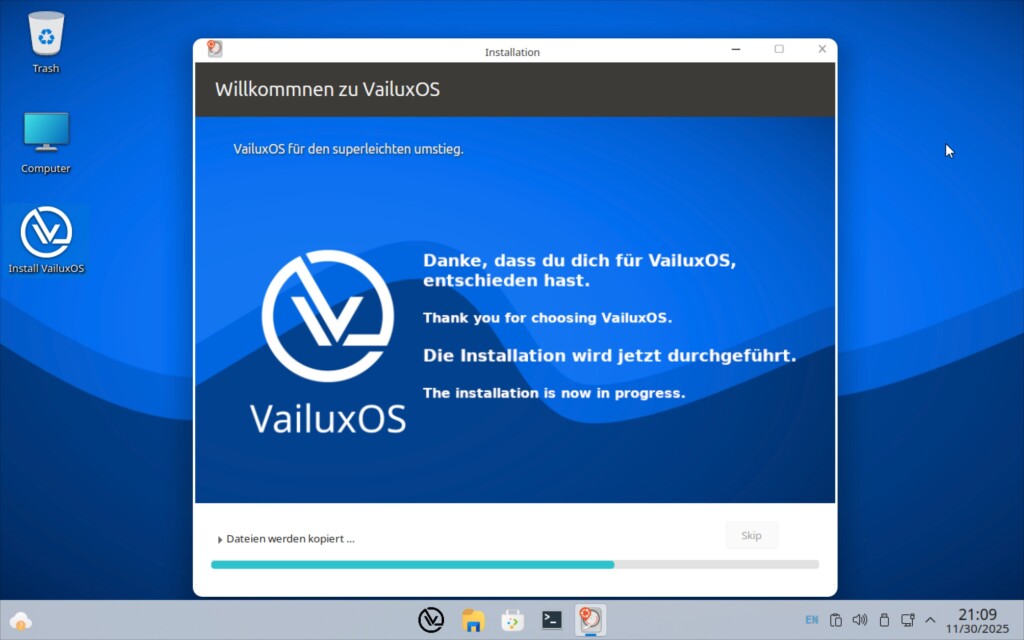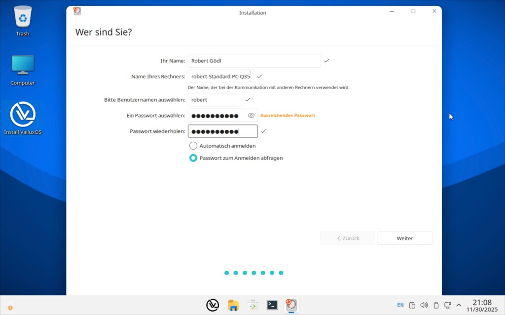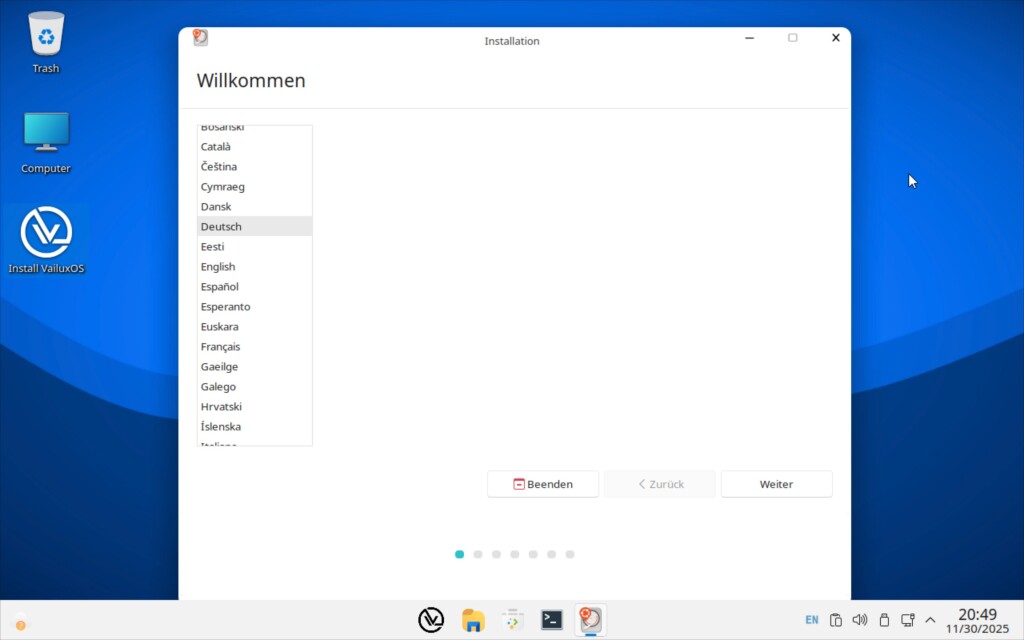 Eigentlich gar nicht so schlecht, man holt sich alles, was man braucht einfach selbst. Ob es für Einsteiger wirklich so gut ist? Egal, wir sehen uns die Installation an – das nötige Icon finden Sie am Desktop namens „Install VailuxOS„:
