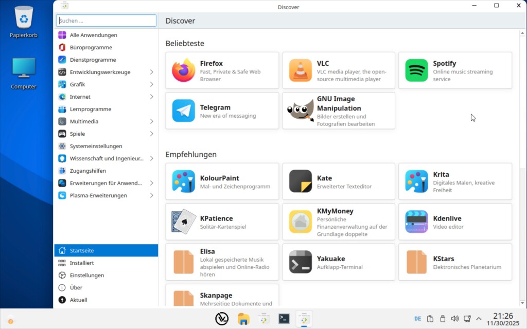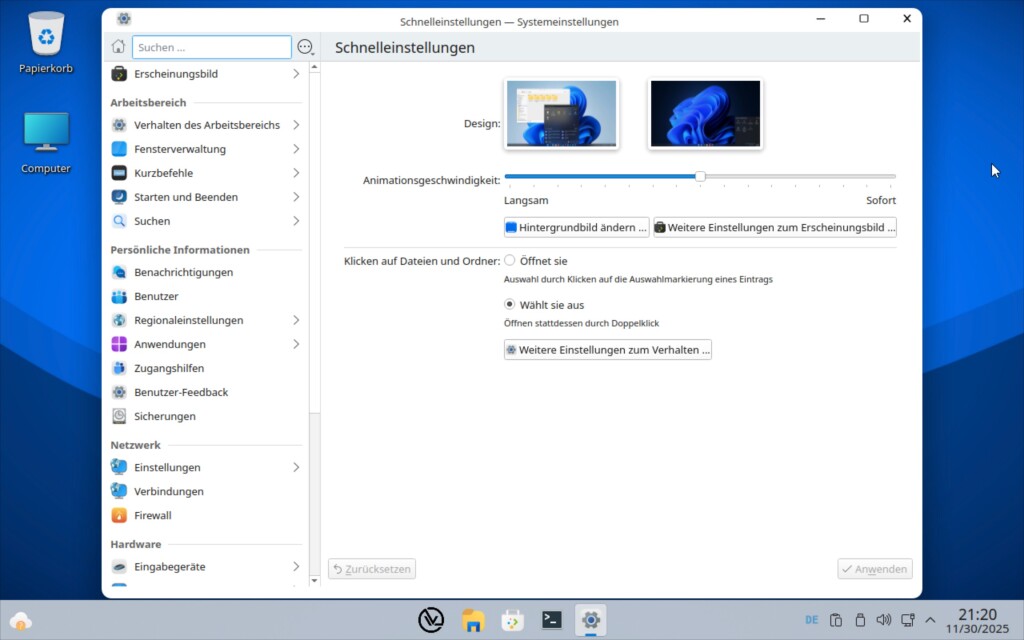 Das System ist gleich einmal in Deutsch, Sie müssen keine weiteren Einstellungen vornehmen. Für die Einstellungen finden Sie gleich einmal die „Systemeinstellungen“ im Anwendungsmenü, für die Einstellungen wird Systemsettings eingesetzt – Standard unter KDE (hierfür gibt es bereits mehrere Beiträge auf der Linux Bibel – einfach mal die Kategorien rechts öffnen):