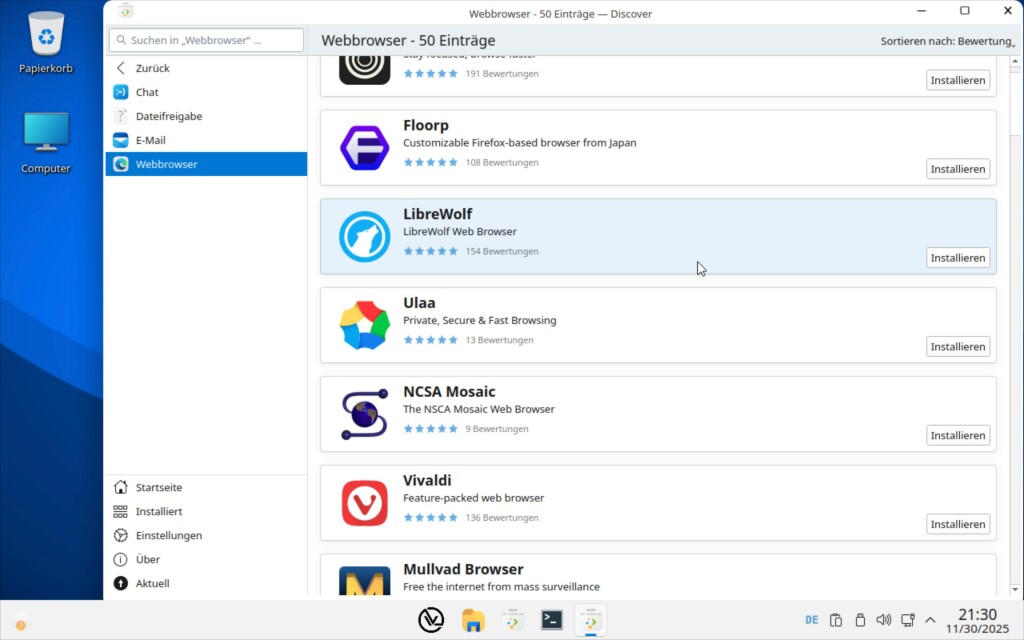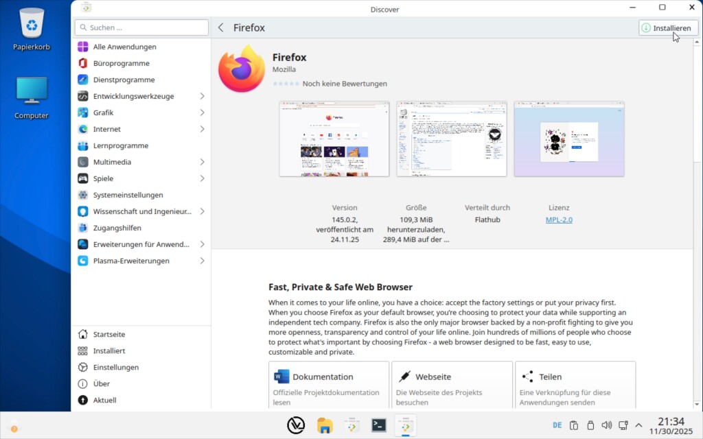 Die Eingabe des Passwortes ist in Discover nicht nötig – es handelt sich bei Firefox um ein Flatpak, bei Debian-Paketen wird dies natürlich schon der Fall sein.