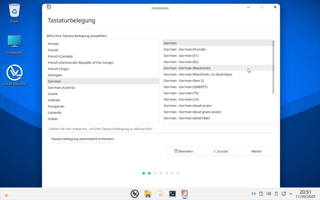 Es folgt die Tastaturbelegung – natürlich die Sonderzeichen testen.