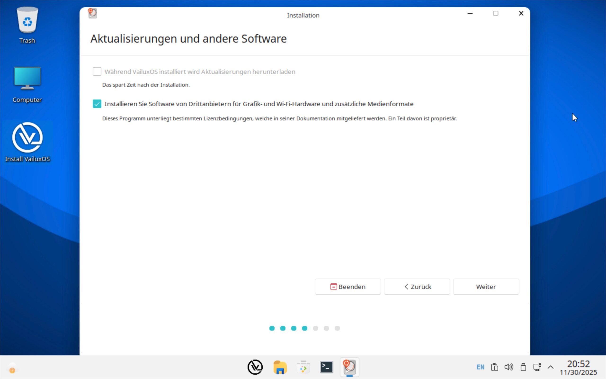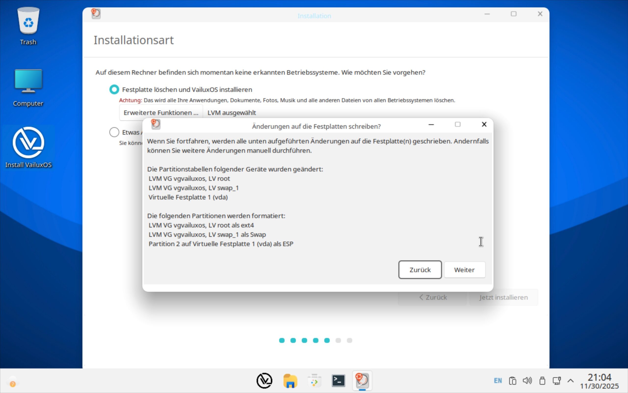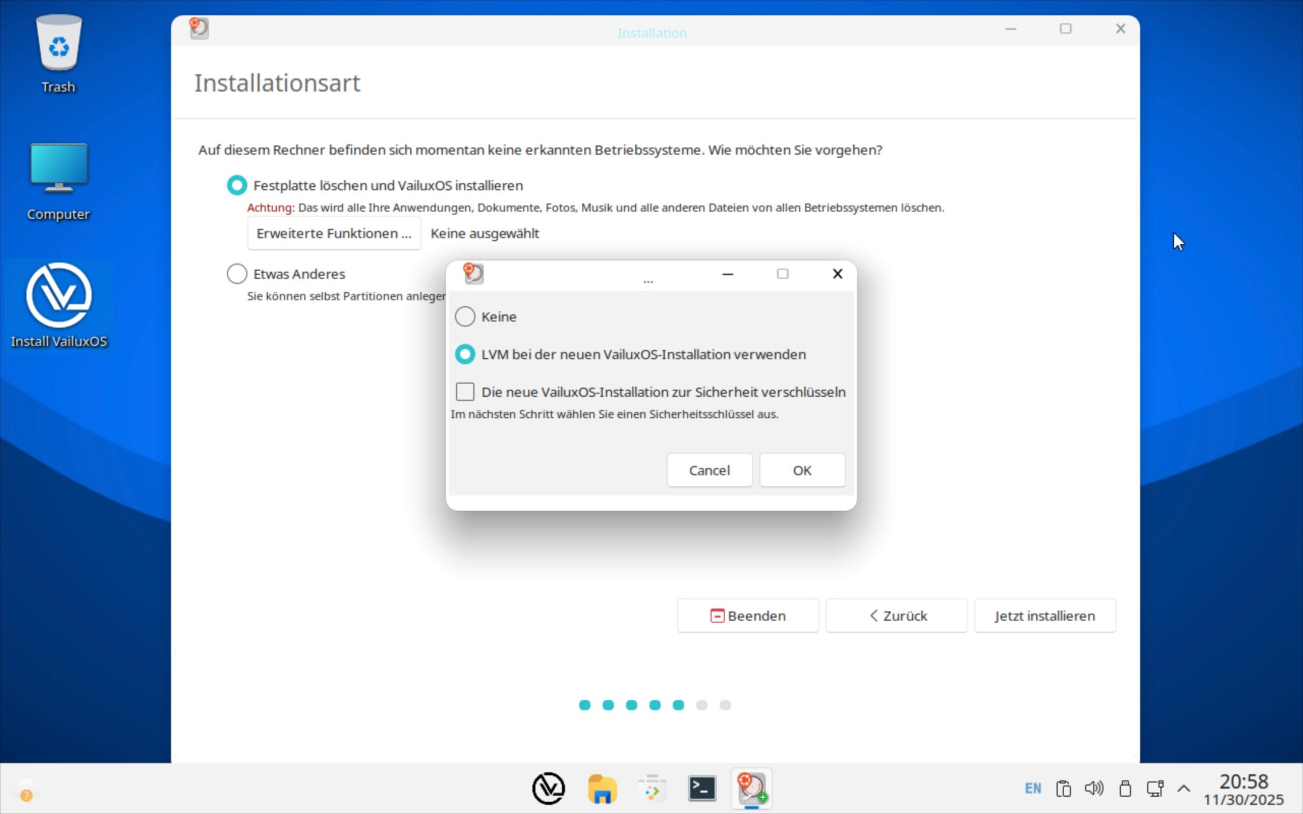 Eigentlich gar nicht so schlecht, man holt sich alles, was man braucht einfach selbst. Ob es für Einsteiger wirklich so gut ist? Egal, wir sehen uns die Installation an – das nötige Icon finden Sie am Desktop namens „Install VailuxOS„: