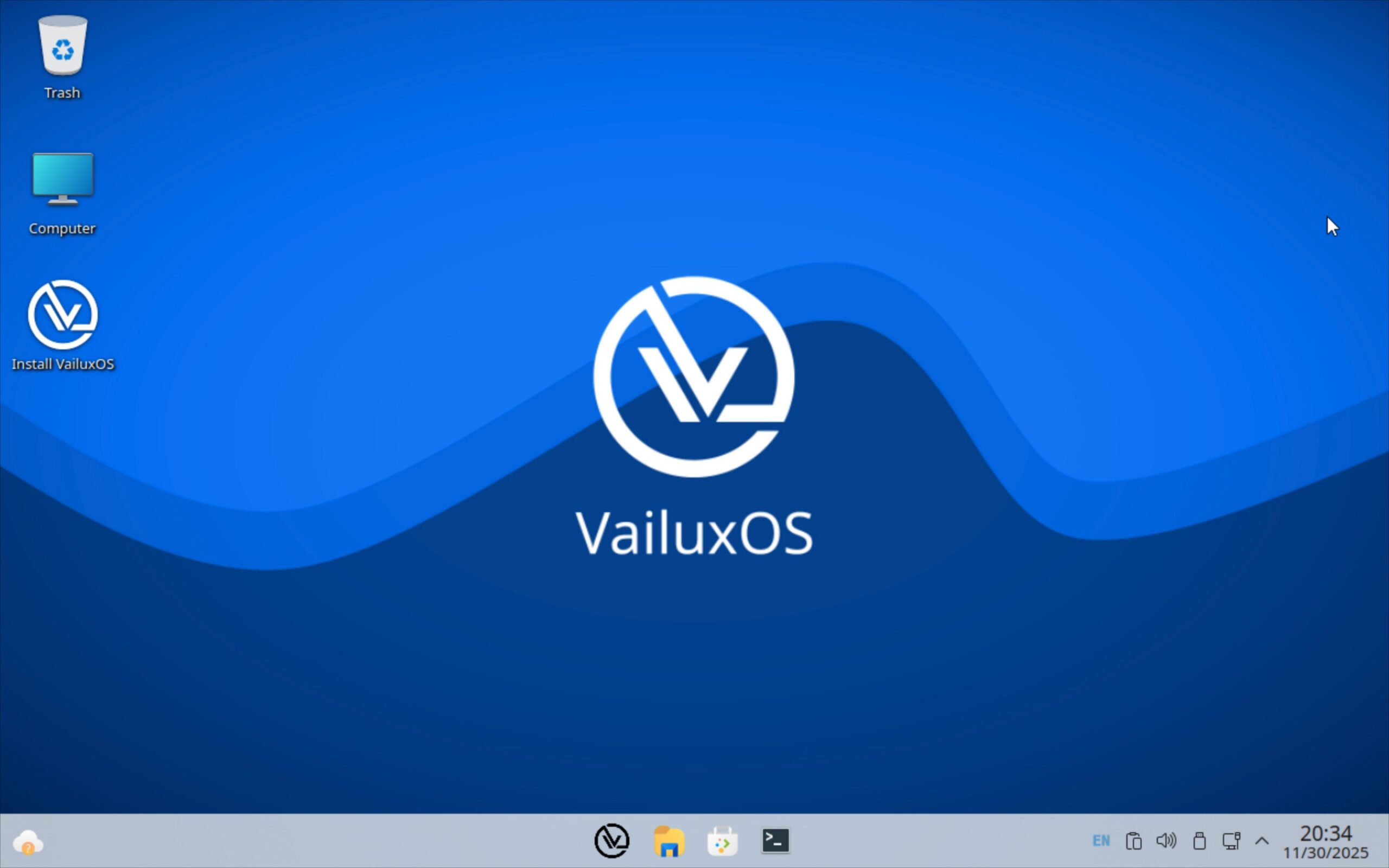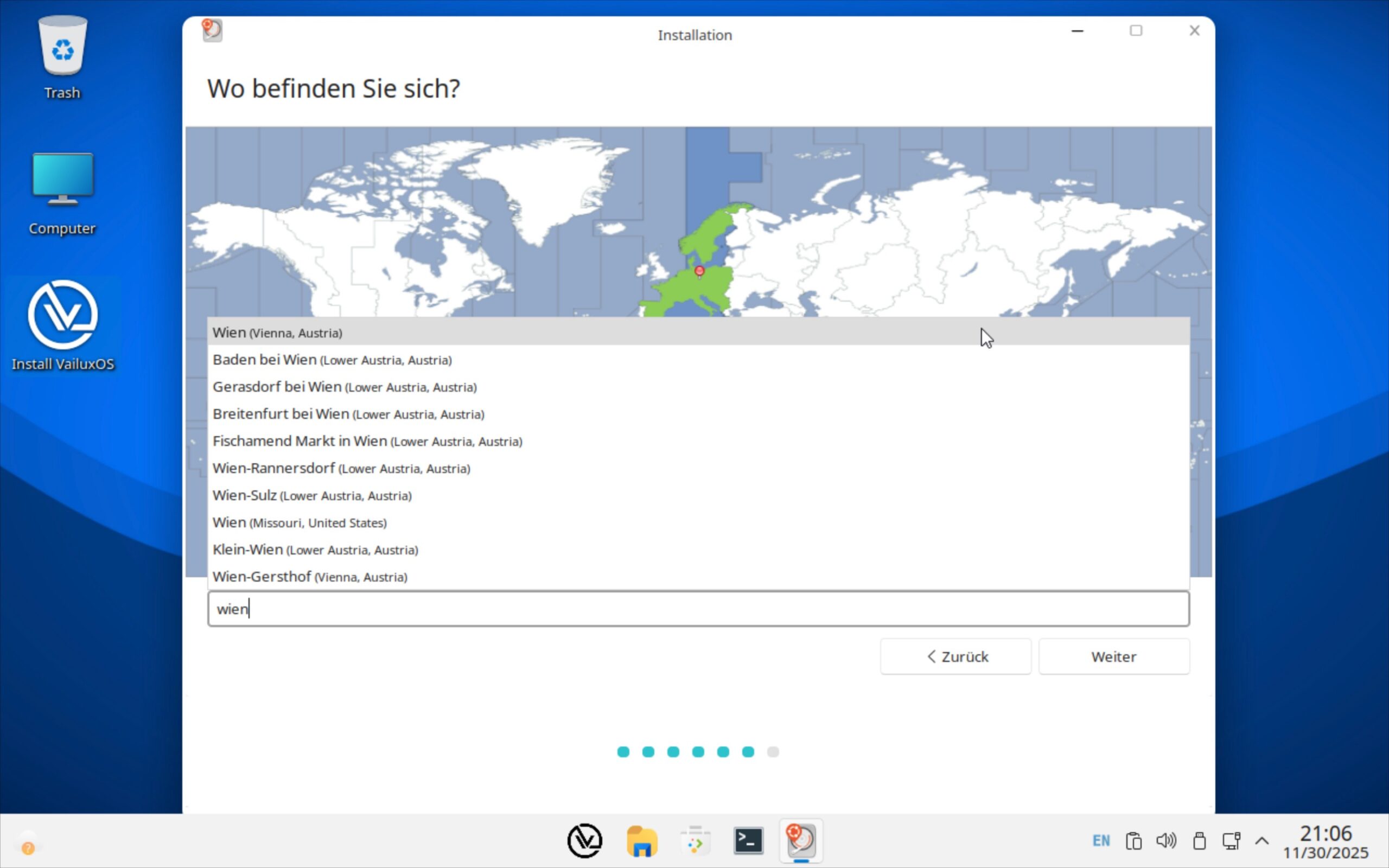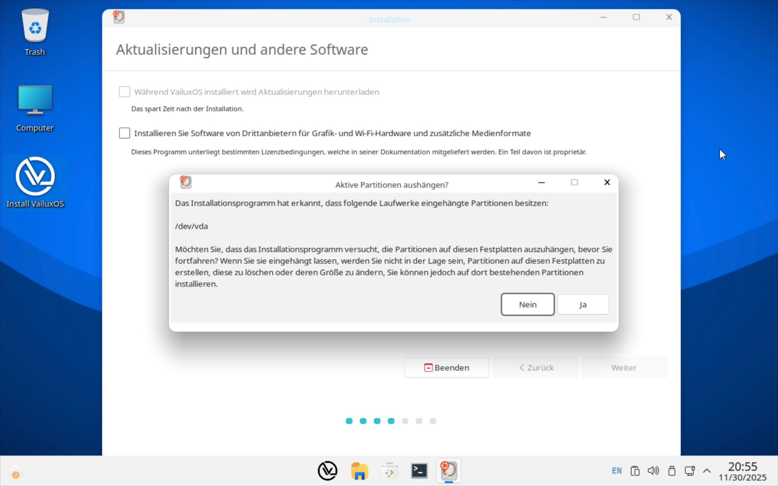 Eigentlich gar nicht so schlecht, man holt sich alles, was man braucht einfach selbst. Ob es für Einsteiger wirklich so gut ist? Egal, wir sehen uns die Installation an – das nötige Icon finden Sie am Desktop namens „Install VailuxOS„: