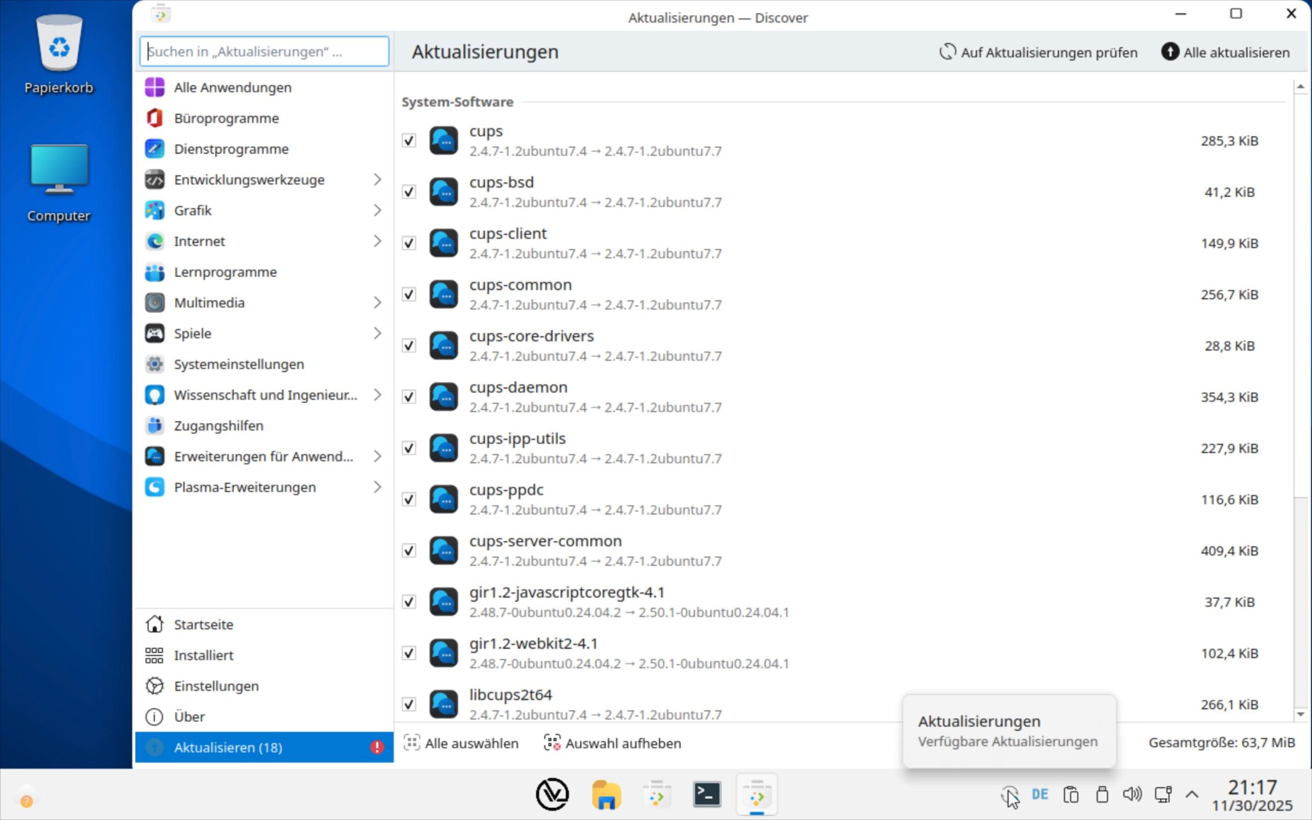 Das System startet auch schnell in den Desktop, und bietet gleich einmal Aktualisierungen an – hierzu poppt ein Fenster auf, ist man nicht schnell genug, draufzuklicken, finden Sie das Icon rechts in der Kontrollleiste: