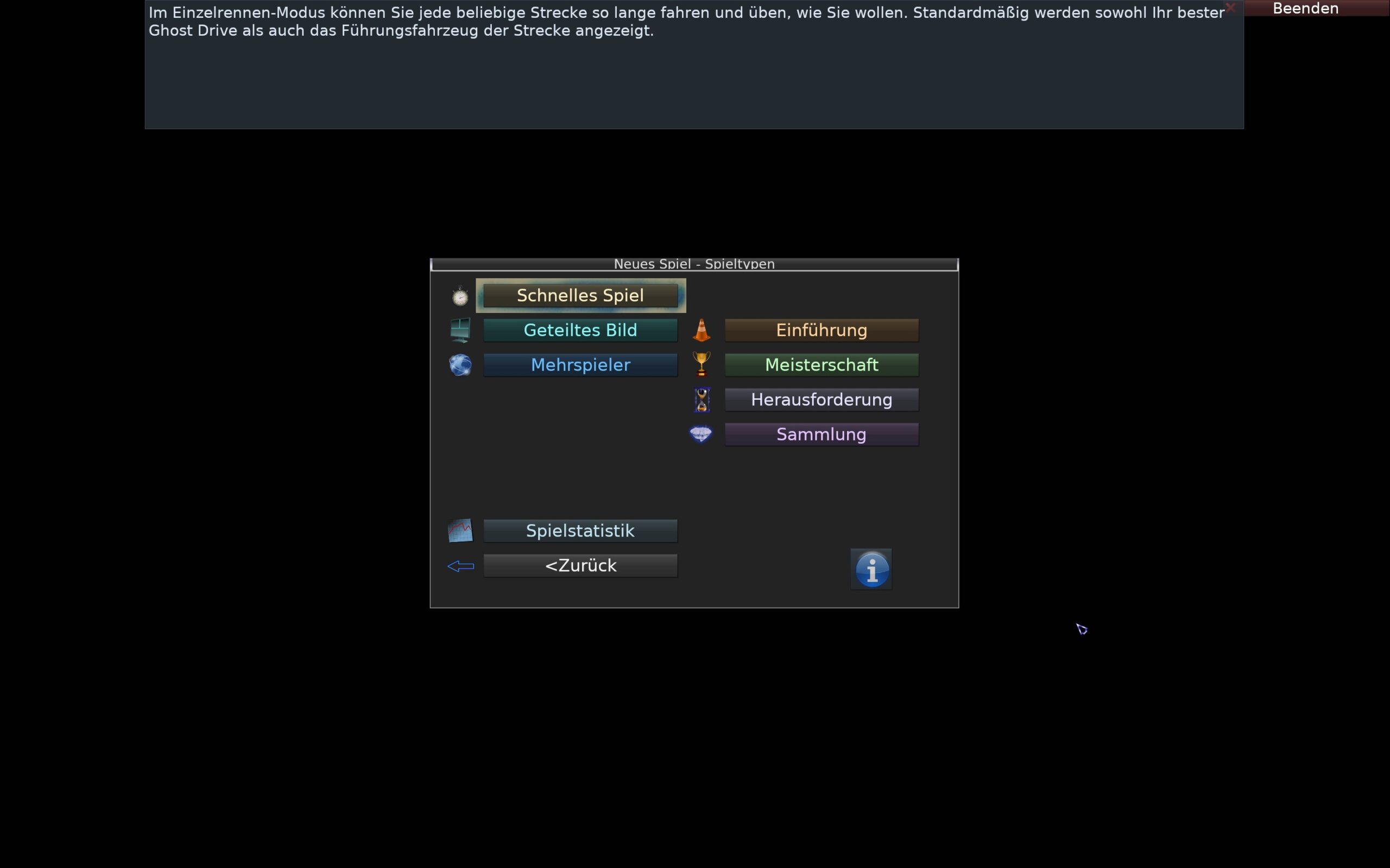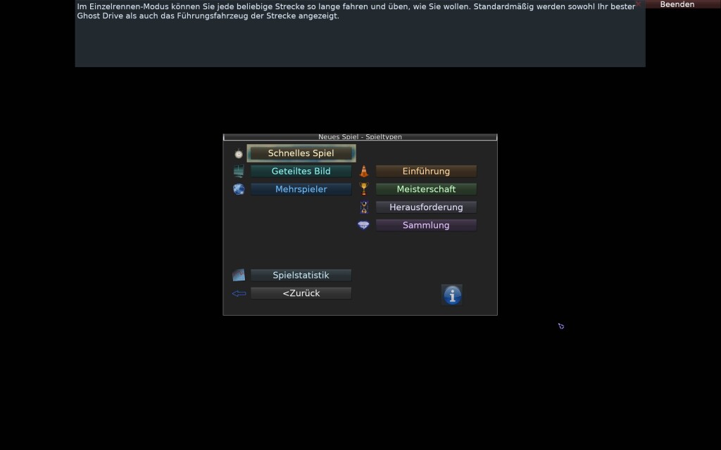Der sinnliche Bildschirm führt über die Optionen zu den Grafik-Einstellungen und mehr, aber auch zum Strecken-Editor – „Neues Spiel„: