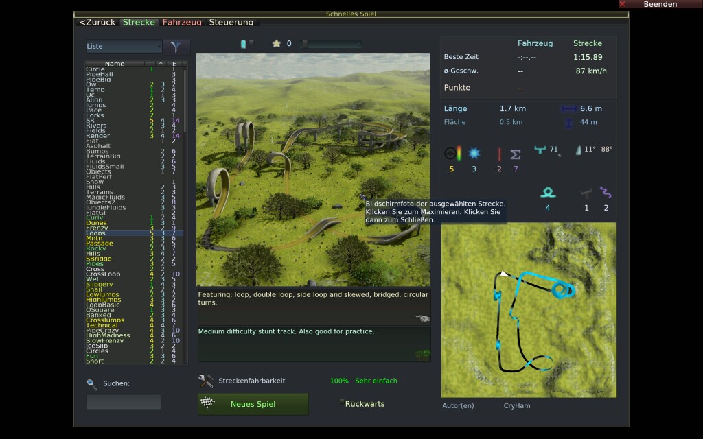 Unter „Schnelles Spiel“ kommen Sie gleich zur Auswahl der Strecke, hier zeigen sich schnell geschätzt hundert verschiedene: