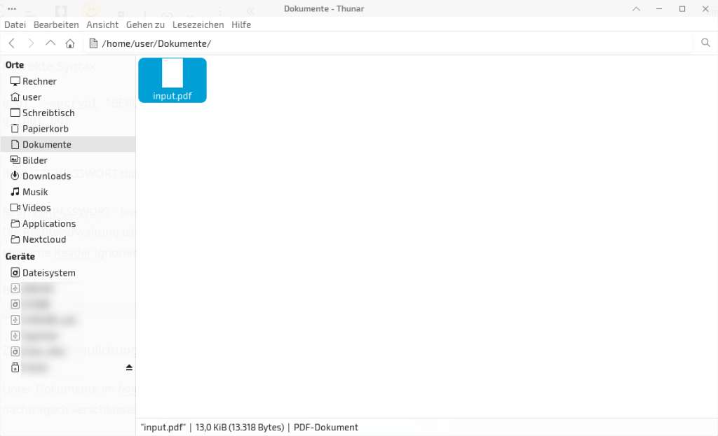 Unter Dokumente im home-Bereich befindet sich die PDF-Datei input.pdf die nachträglich verschlüsselt werden soll…