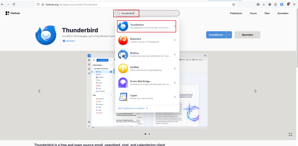 Möchte man bspw. Thunderbird als Flatpak installieren, geht man wie folgt vor. Besuchen Sie den Flathub-Store und geben einen entsprechenden Suchbegriff ein…