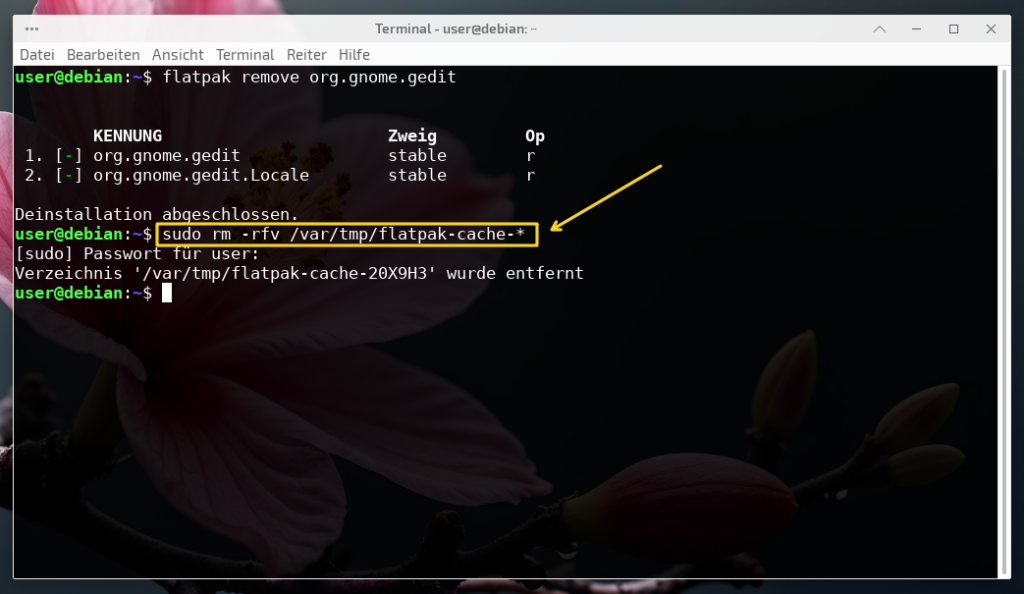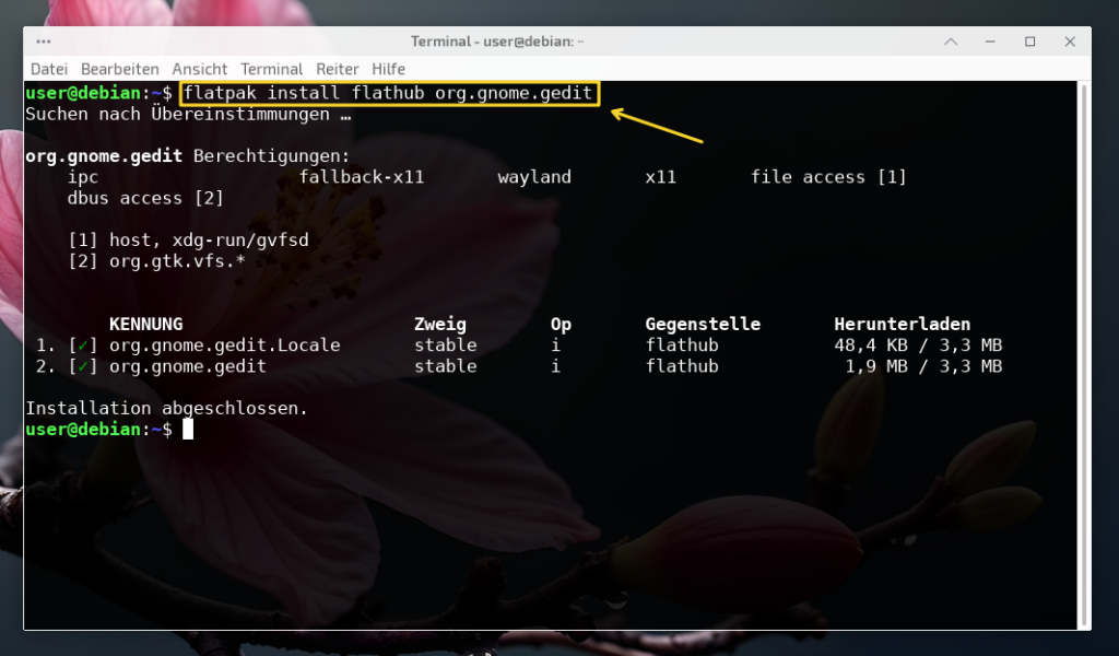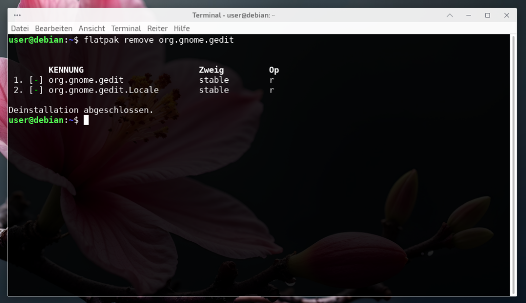Benötigt man ein Flatpak nicht mehr, lässt es sich natürlich auch wieder entfernen. Zuerst verschafft man sich einen Überblick über die installierten Flatpak-Anwendungen mit folgenden Befehl im Terminal, der diese so auflistet, dass links der Name der Anwendung und rechts die zugehörige Kennung erscheint. Das ist praktisch, da die Kennung Teil des Deinstallations-Befehls ist…