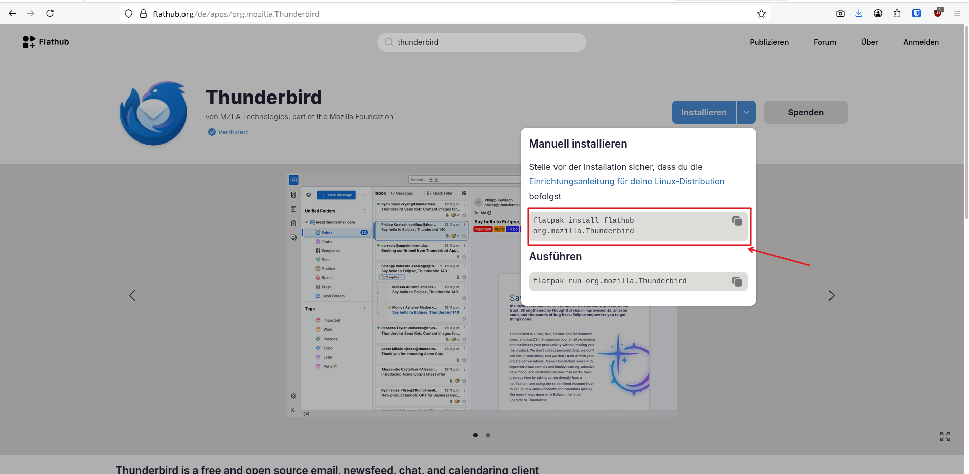 Möchte man bspw. Thunderbird als Flatpak installieren, geht man wie folgt vor. Besuchen Sie den Flathub-Store und geben einen entsprechenden Suchbegriff ein…