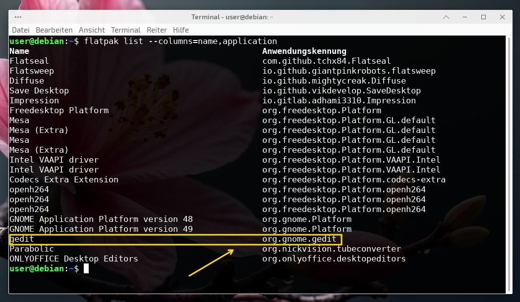 Benötigt man ein Flatpak nicht mehr, lässt es sich natürlich auch wieder entfernen. Zuerst verschafft man sich einen Überblick über die installierten Flatpak-Anwendungen mit folgenden Befehl im Terminal, der diese so auflistet, dass links der Name der Anwendung und rechts die zugehörige Kennung erscheint. Das ist praktisch, da die Kennung Teil des Deinstallations-Befehls ist…