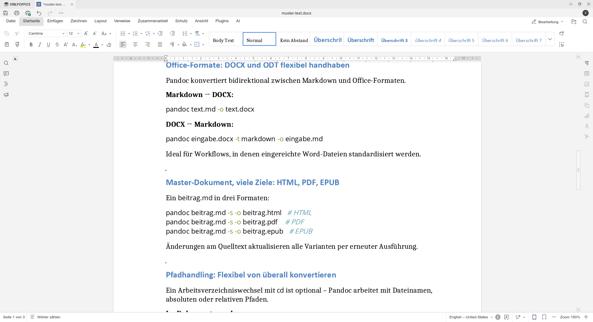 Bei der täglichen Arbeit mit Texten entstehen oft unterschiedliche Anforderungen: Notizen liegen als Markdown-Dateien vor, Kolleginnen und Kollegen benötigen Word-Dokumente, Veröffentlichungen verlangen PDF, und für Websites ist HTML gefragt.