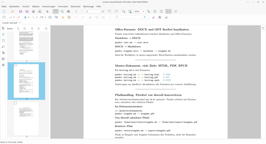 Ein einziger Quelltext – meist in Markdown – genügt, um daraus automatisch eine PDF-Datei, ein Word-Dokument oder eine Webseite zu erzeugen. Die Bedienung erfolgt bequem über einfache Terminalbefehle.