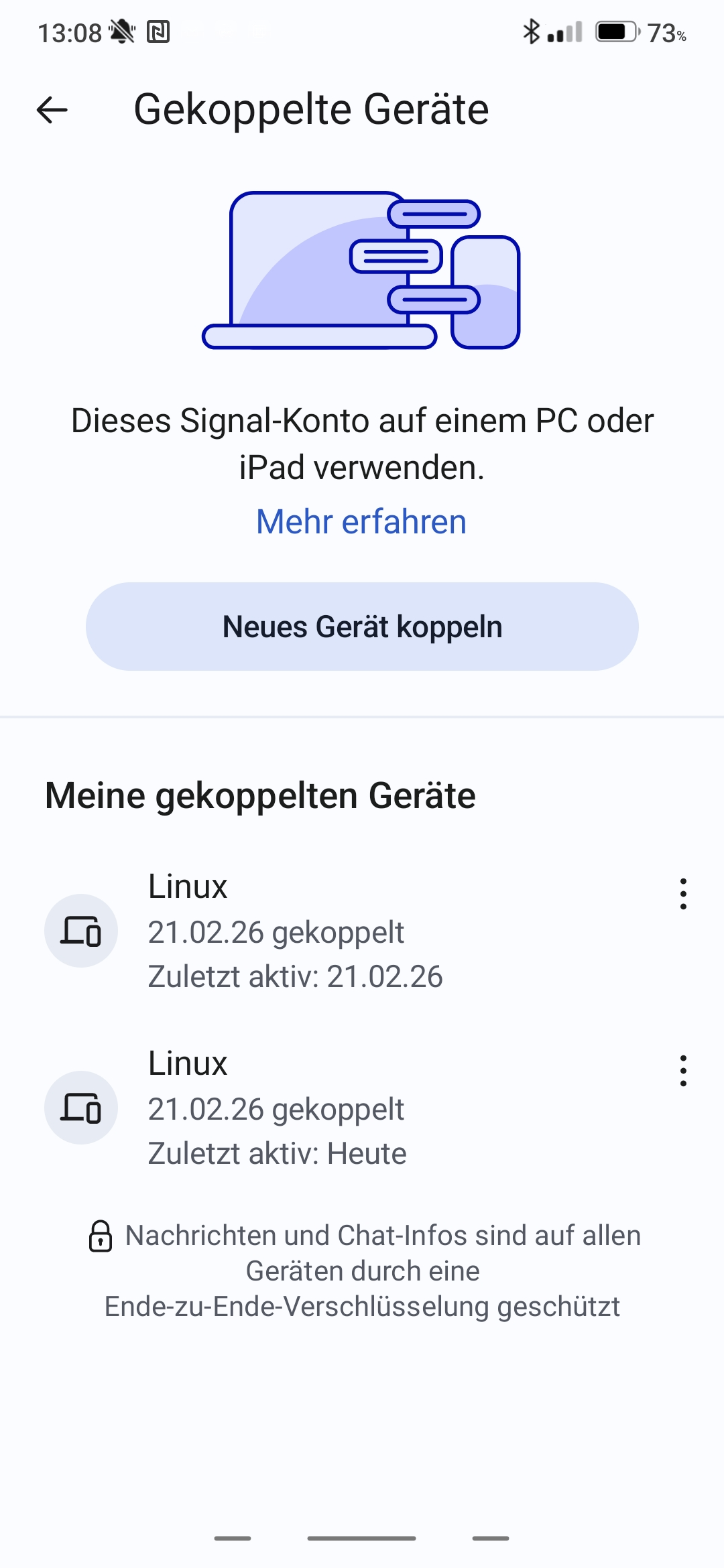 Um Signal mit dem Desktop-PC zu dauerhaft zu verbinden/koppeln öffnen Sie die Anwendung auf Ihrem Smartphone. In Android unter Einstellungen > Gekoppelte Geräte wählen Sie hier Neues Gerät koppeln…