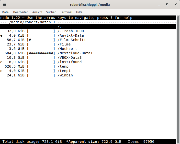 ncdu ist ein kleines Programmchen, dass eine Übersicht über den Festplatten-Verbrauch einzelnen Teile des Systems gibt. Ähnlich dem du Kommando im Terminal liefert es Informationen, kann aber auch innerhalb dieses Tree navigieren.