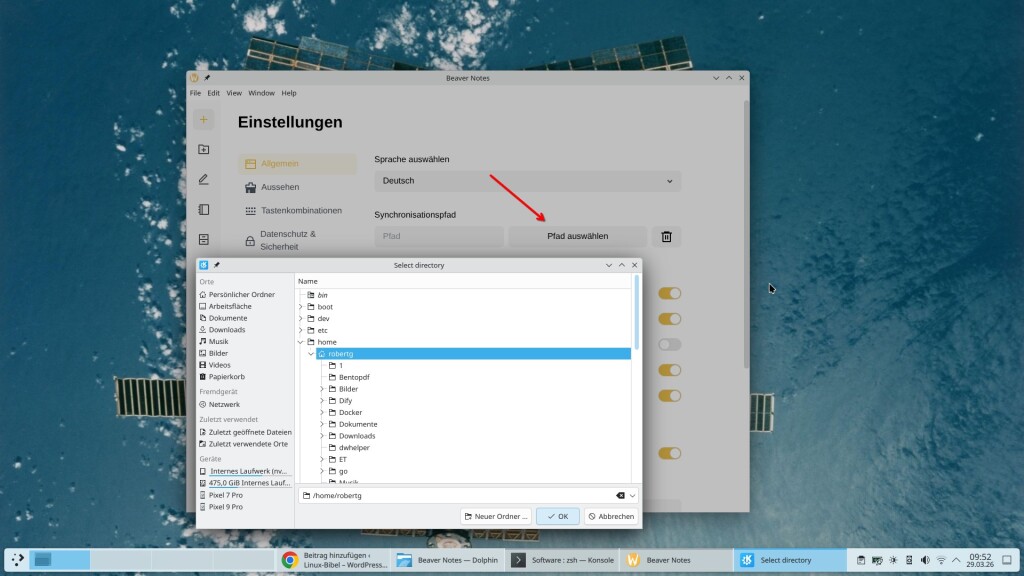 Hierzu wollen Sie natürlich nicht das Standard-Verzeichnis teilen, sondern ein passendes. Öffnen Sie zu Beginn die Einstellungen und geben unter „Allgemein“ ein Verzeichnis zur Synchronisation an – in diesem liegen anschließend nur die Notizen: