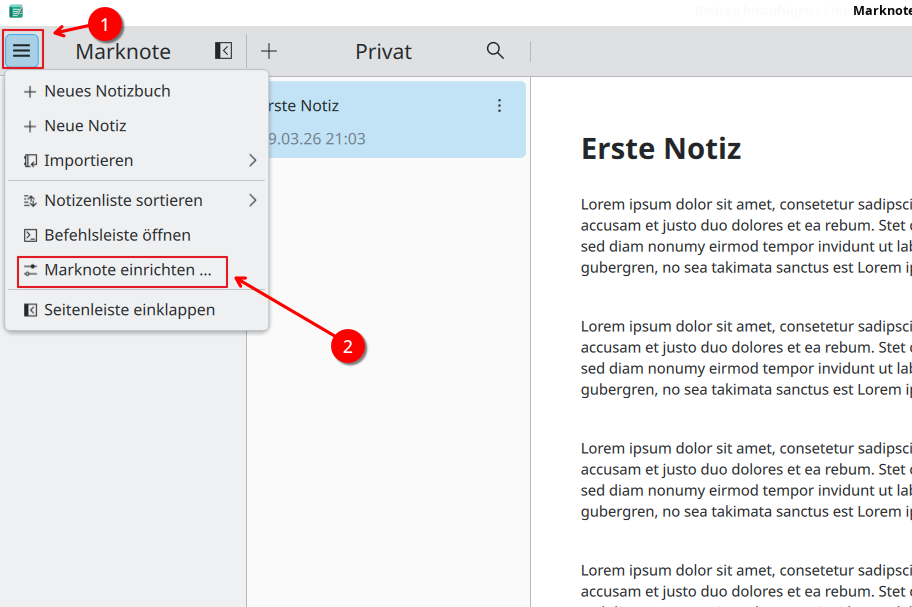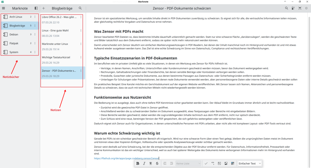 Die Notiz wird in Marknote gespeichert und liegt anschließend unter home/Dokumente im Verzeichnis »Notes« als Markdown-Datei/en vor . Dadurch ist sie nicht an das Programm gebunden und kann bei Bedarf mit anderen Werkzeugen geöffnet werden…
