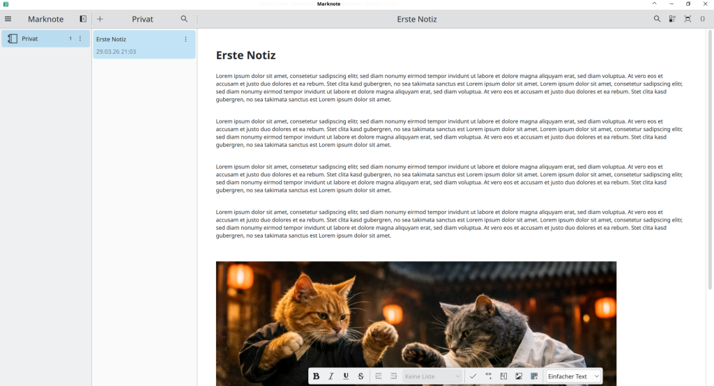 … danach kann der eigentliche Text geschrieben werden. Marknote unterstützt Rich-Text-Notizen, also einfache Formatierungen wie fett oder kursiv, was den Text übersichtlicher macht. Das Einfügen von Bildern ist ebenso möglich…