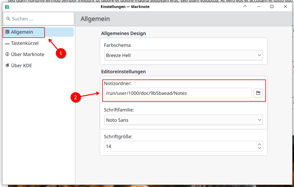 Unter Allgemein -> Editoreinstellungen kann der Pfad zum Notiz-Ordner z.B. zur Cloud-Anbindung verschoben werden…