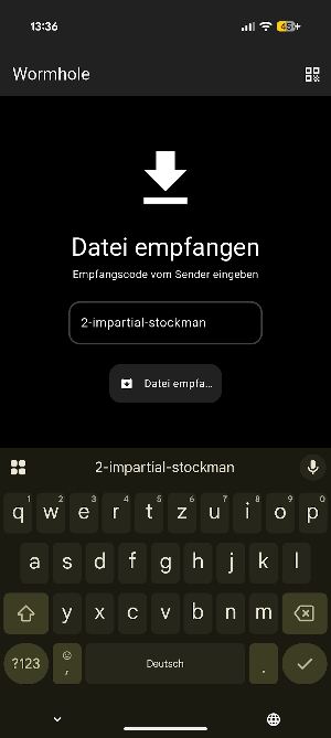 Der Empfänger nutzt den QR-Code, den Sie diesem senden oder das Passwort und kann anschließend die Datei empfangen. Beides ist nur einmal gültig.