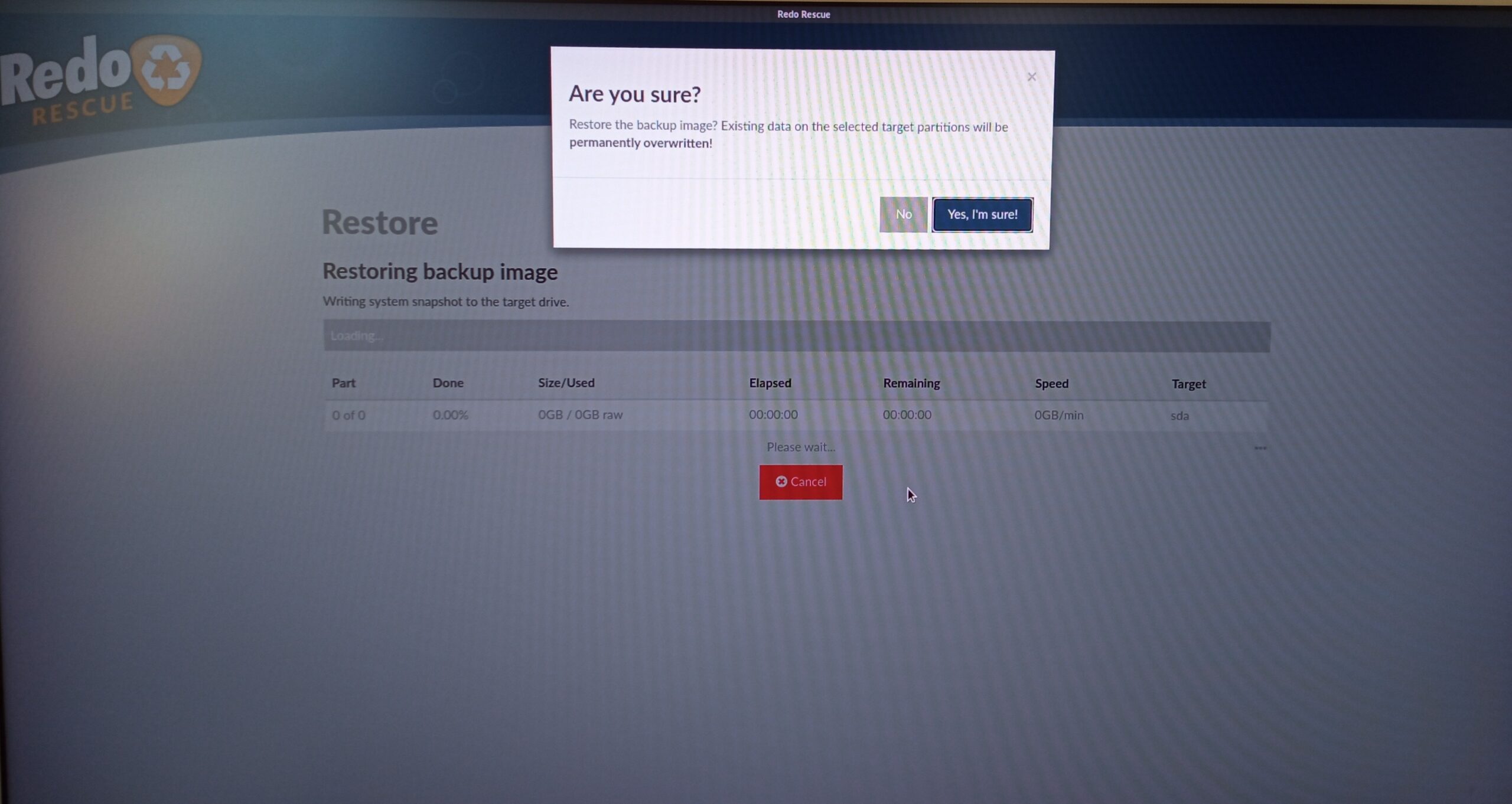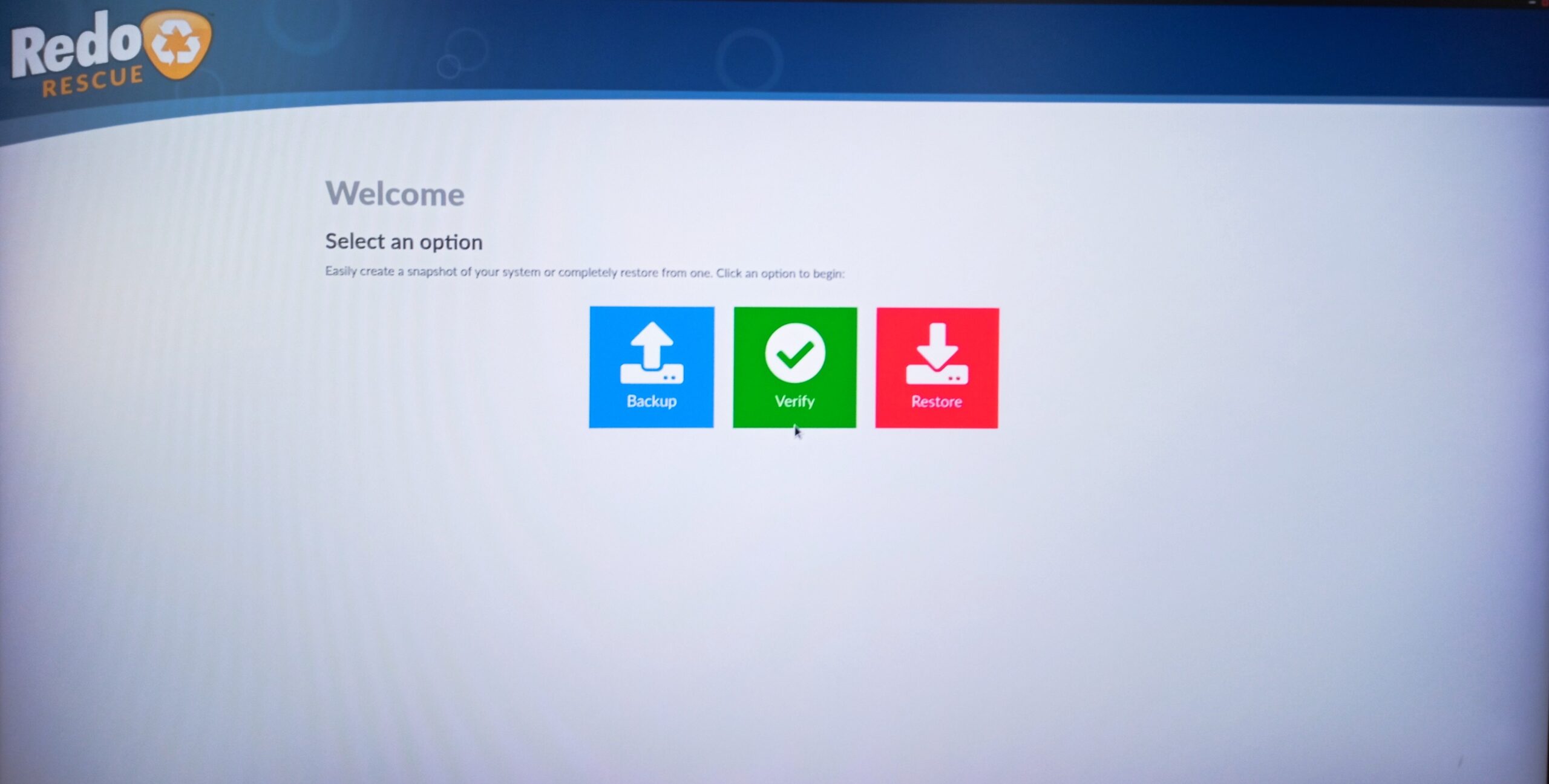 Schließen Sie den Redo Rescue USB-Stick an und starten den PC davon. Warten Sie auf den Start-Bildschirm und klicken dann auf Restore…